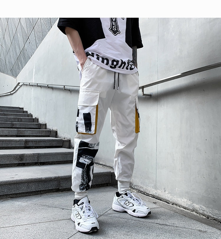 Men Black White Patchwork Casual Techwear Cargo Pants Punk Hip Hop Streetwear Joggers Man Vintage Slim Fit Sweatpants