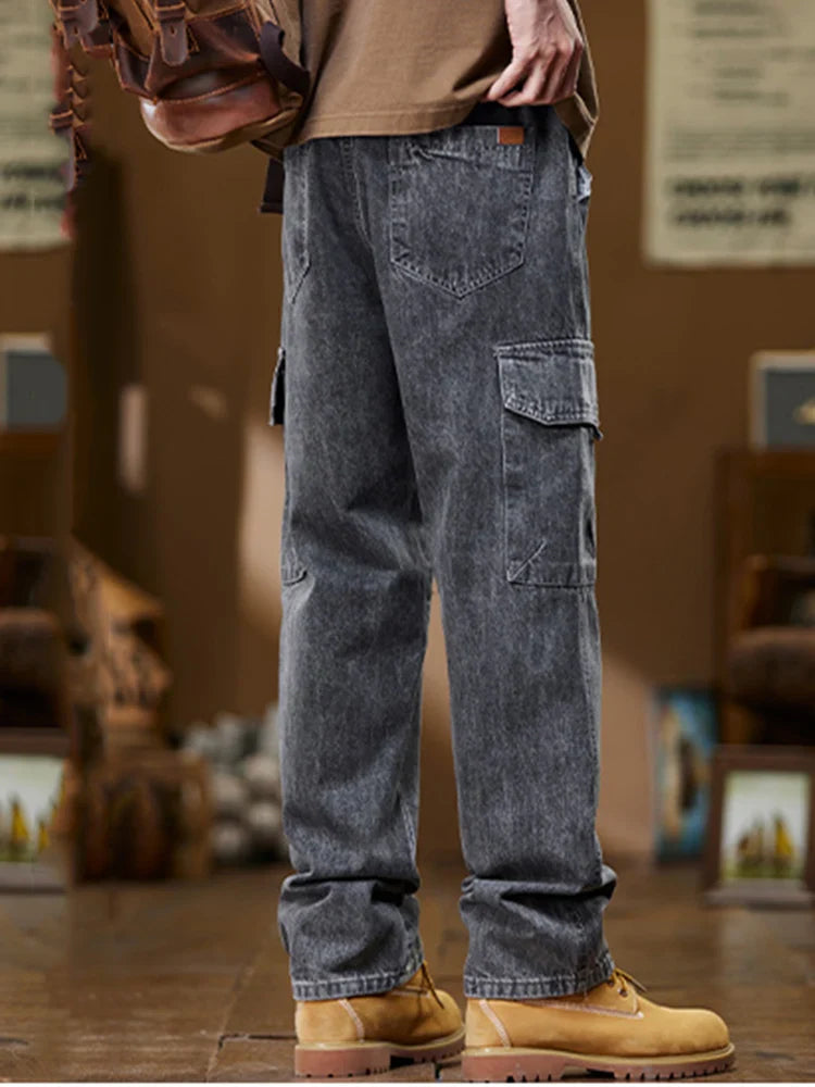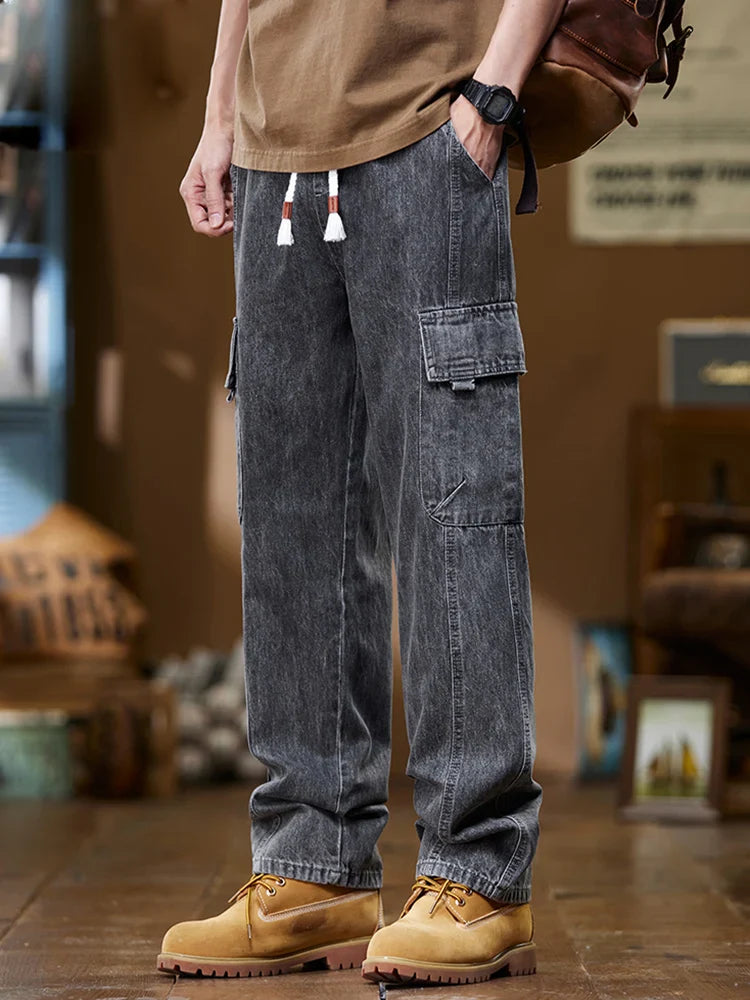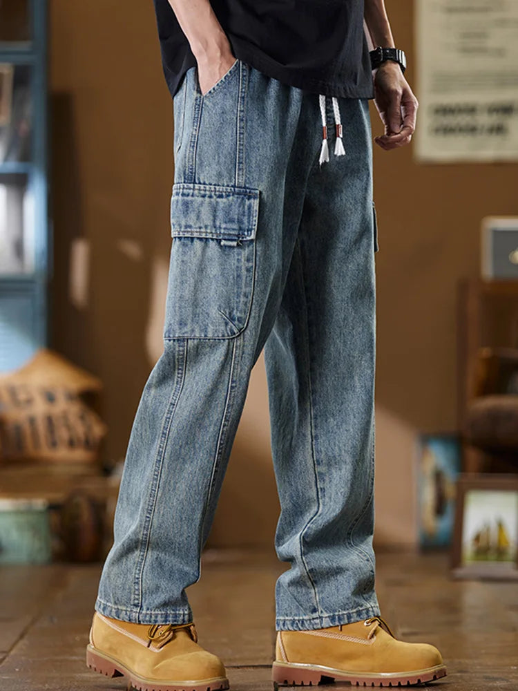 Men Harajuku Daily Elastic Jeans Cargo Denim Pants Male Wash Straight Leg Multi Pockets Casual Mid Waist Drawstring Trousers