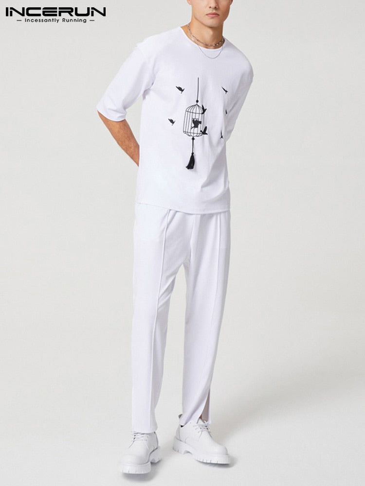 Men Sets Printing Muslim Fashion O-neck Hafl Sleeve T Shirt & Pants 2PCS Streetwear Loose Men Casual Suits S-5XL INCERUN