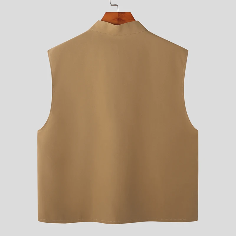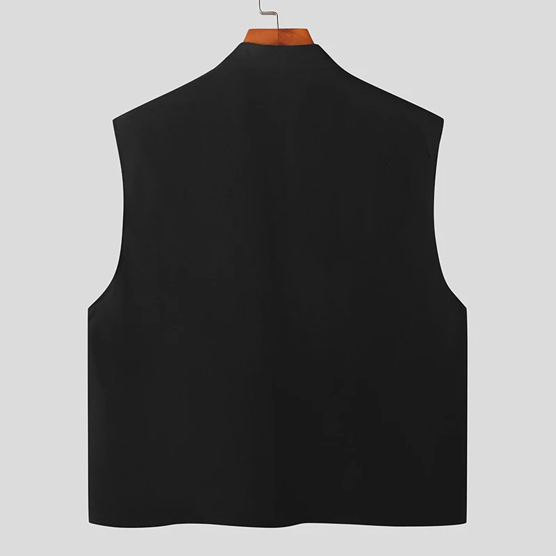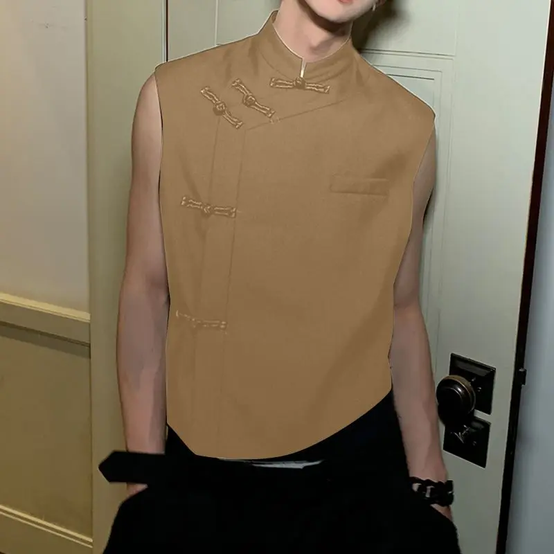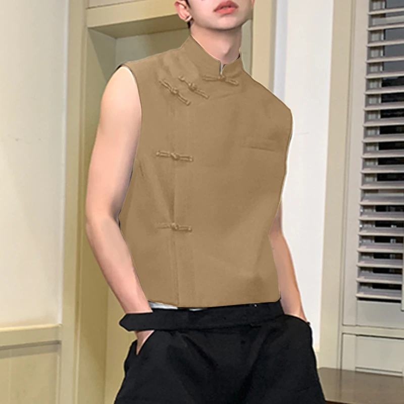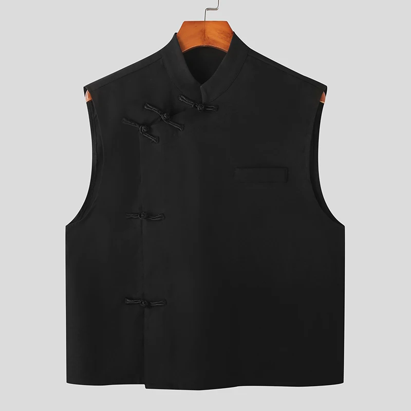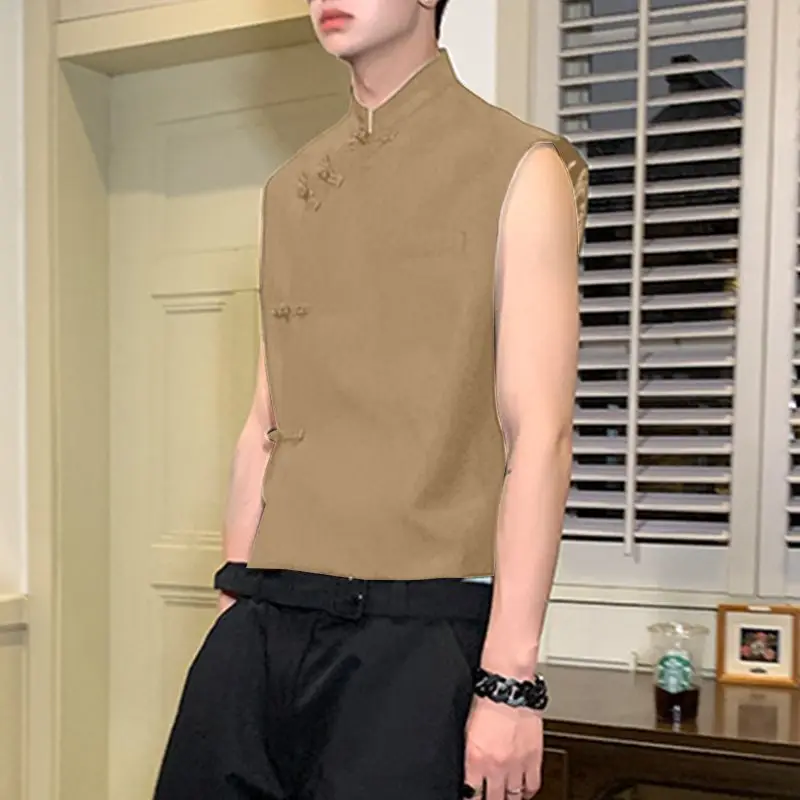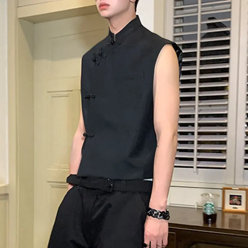 Men Shirt Solid Stand Collar Sleeveless Vintage Chinese Style Knot Button Men Clothing Summer Casual Vests S-5XL