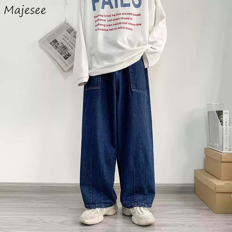 Men Wide Leg Jeans Baggy Retro Blue Japanese Simple Leisure Stylish Soft All-match Pocket Large Size S-3XL Solid New-fashion Hot