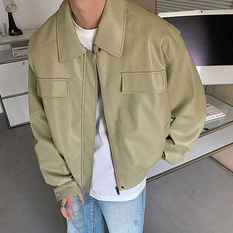 Men's Casual Texture PU Leather Jacket High Street Zippers Turn-down Collar Long Sleeve Retro Coat with Pocket Autumn