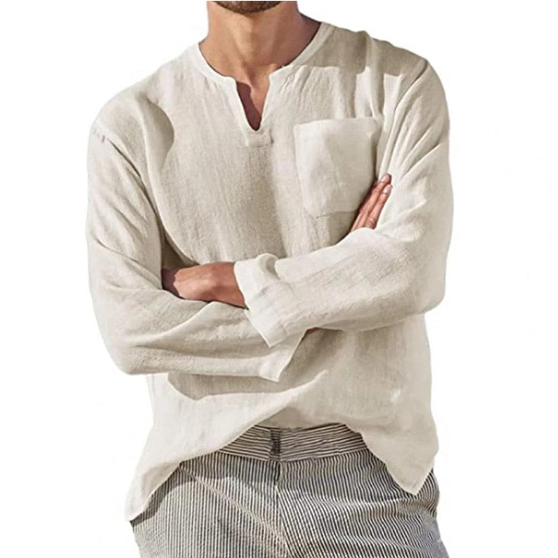 Men's Cotton Linen T Shirt Long Sleeve Hippie Casual Beach Vintage V-Neck Loose Pullover Tops Mens Tees Streetwear