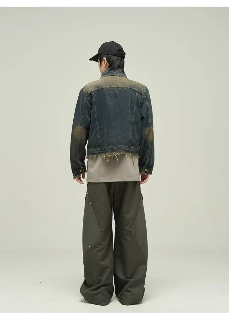 Mens Denim Jacket American Vintage Fake Two Pieces Design Washed Trend Jeans Coat Male Hip Hop High Collar Unisex Outwear 2024