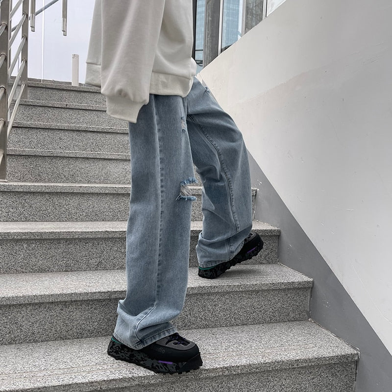 Men's Denim Pant Stretch Ripped Hole Straight Jeans For Men High Street Biker Trousers