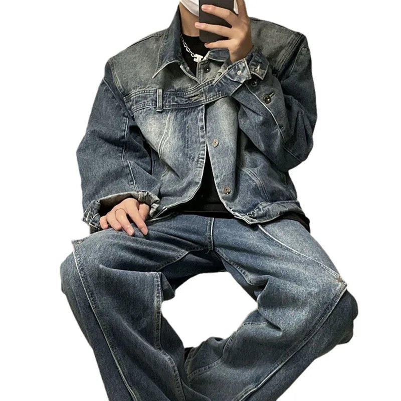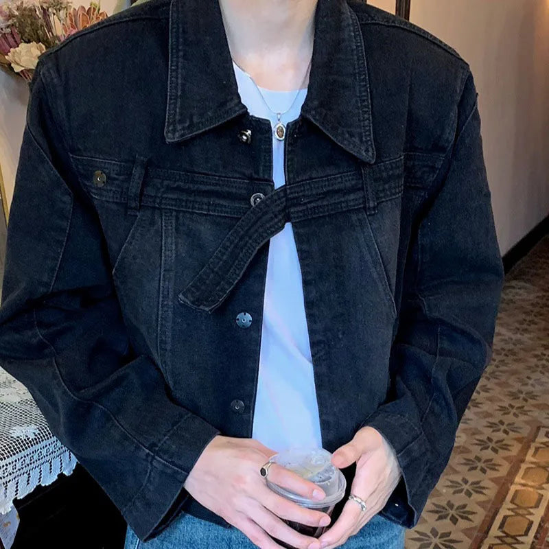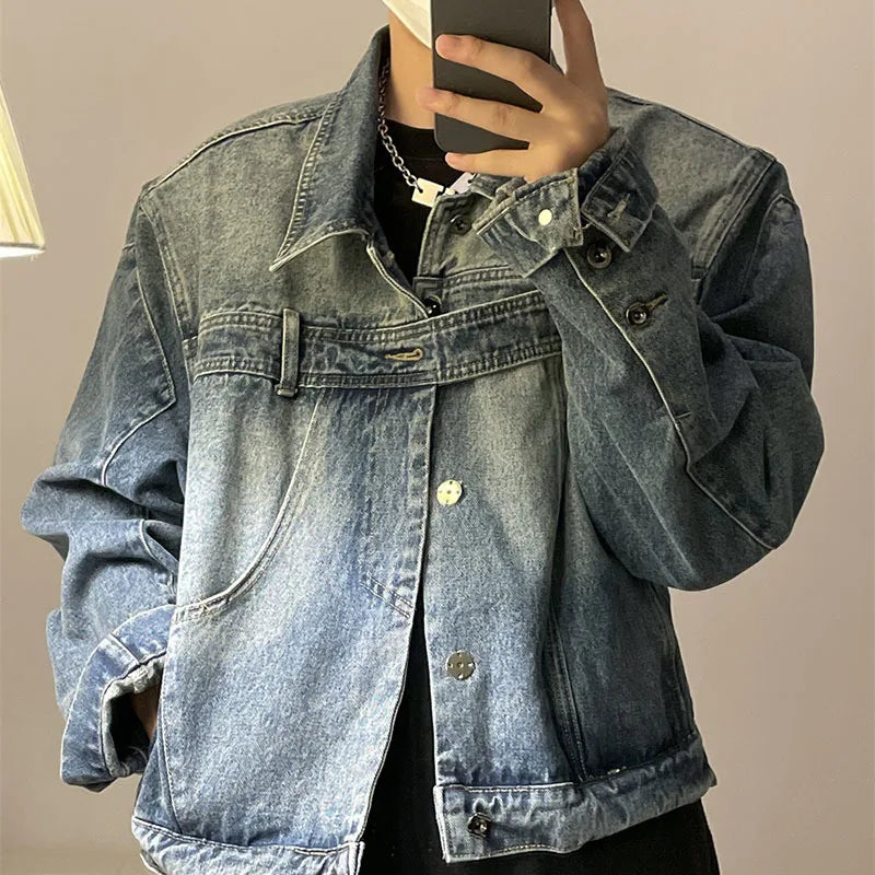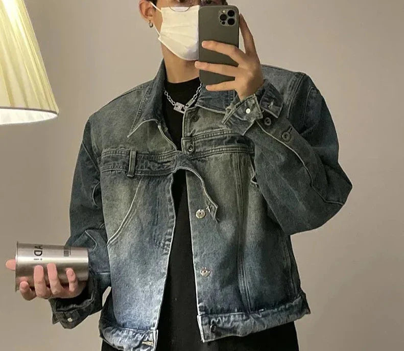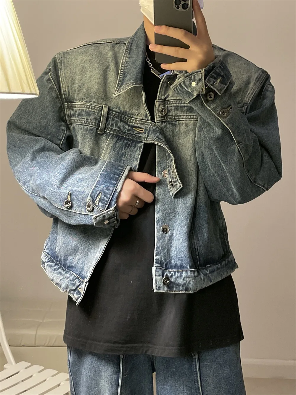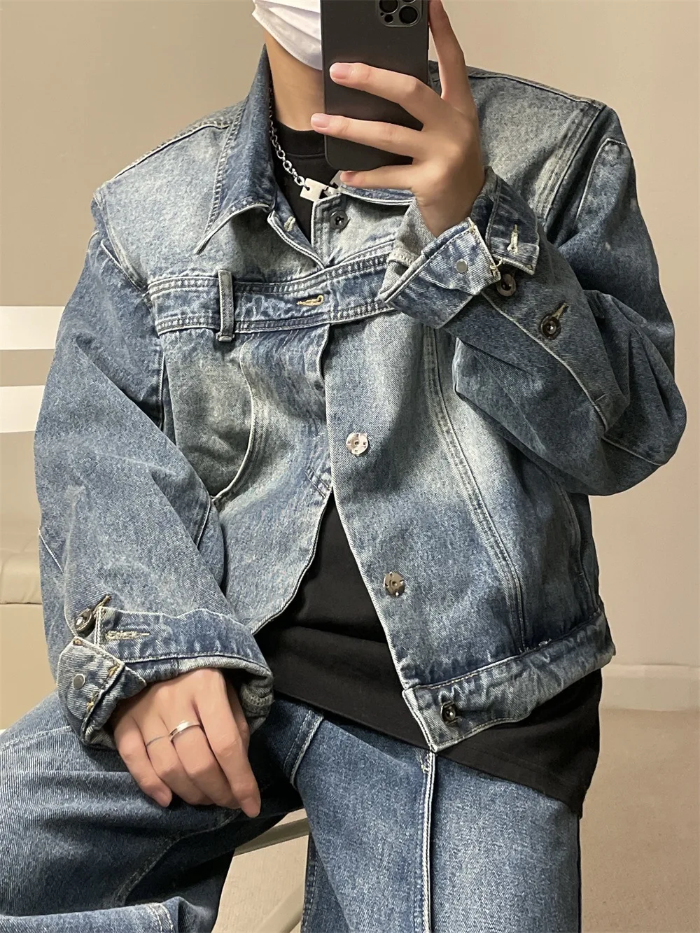 Men's Design Denim Jacket American Vintage Turn-down Collar Belt Design Single Breasted Male Coat High Street