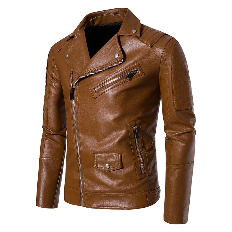 Mens Leather Jackets Solid Turn Down Collar Casual Slim Fit Motorcycle Pu Leather Jacket Men Multiple Pockets Zipper Coat