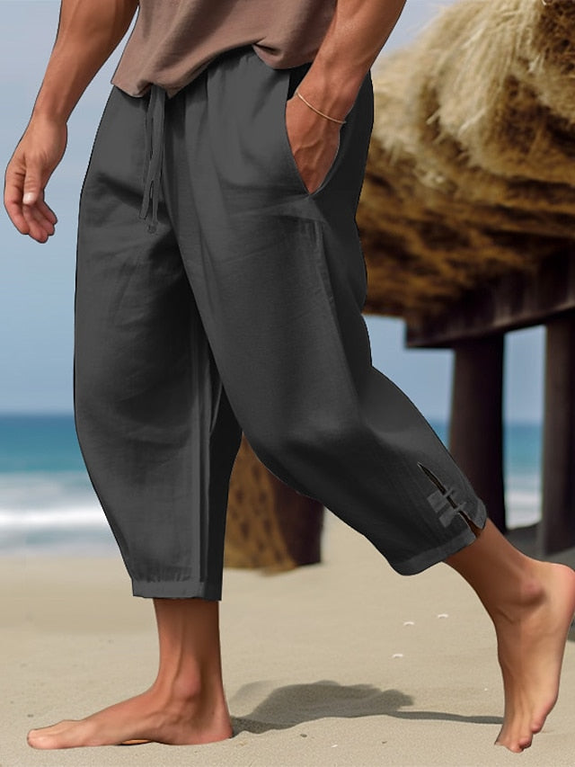 Men's Linen Pants Summer Pants Beach Pants Capri Pants Drawstring Elastic Waist Plain Comfort Breathable Calf-Length Casual Daily Holiday Linen / Cotton Blend Fashion Classic Style Black White