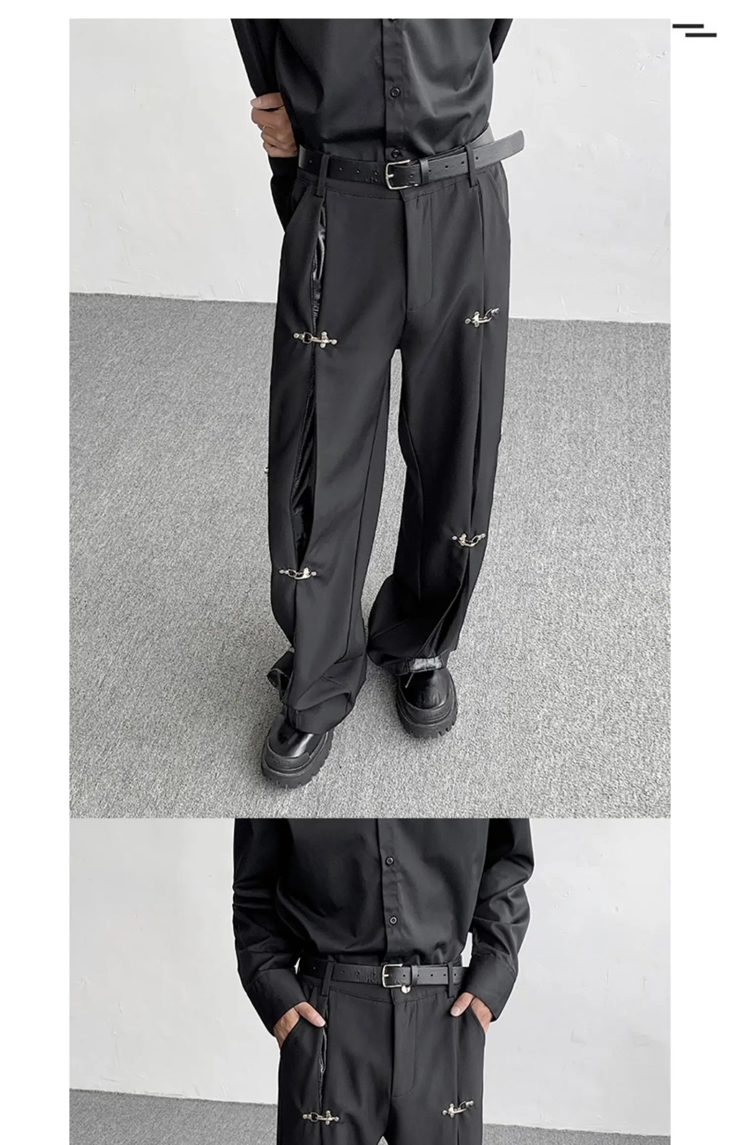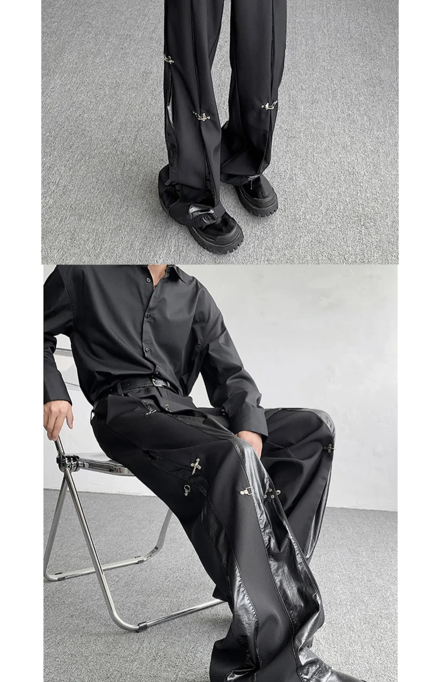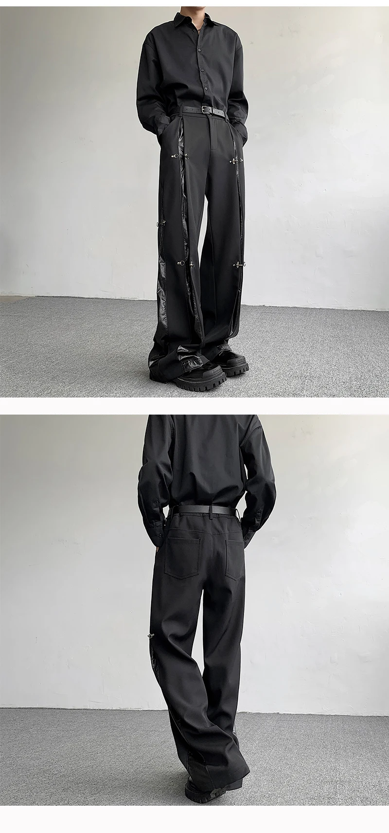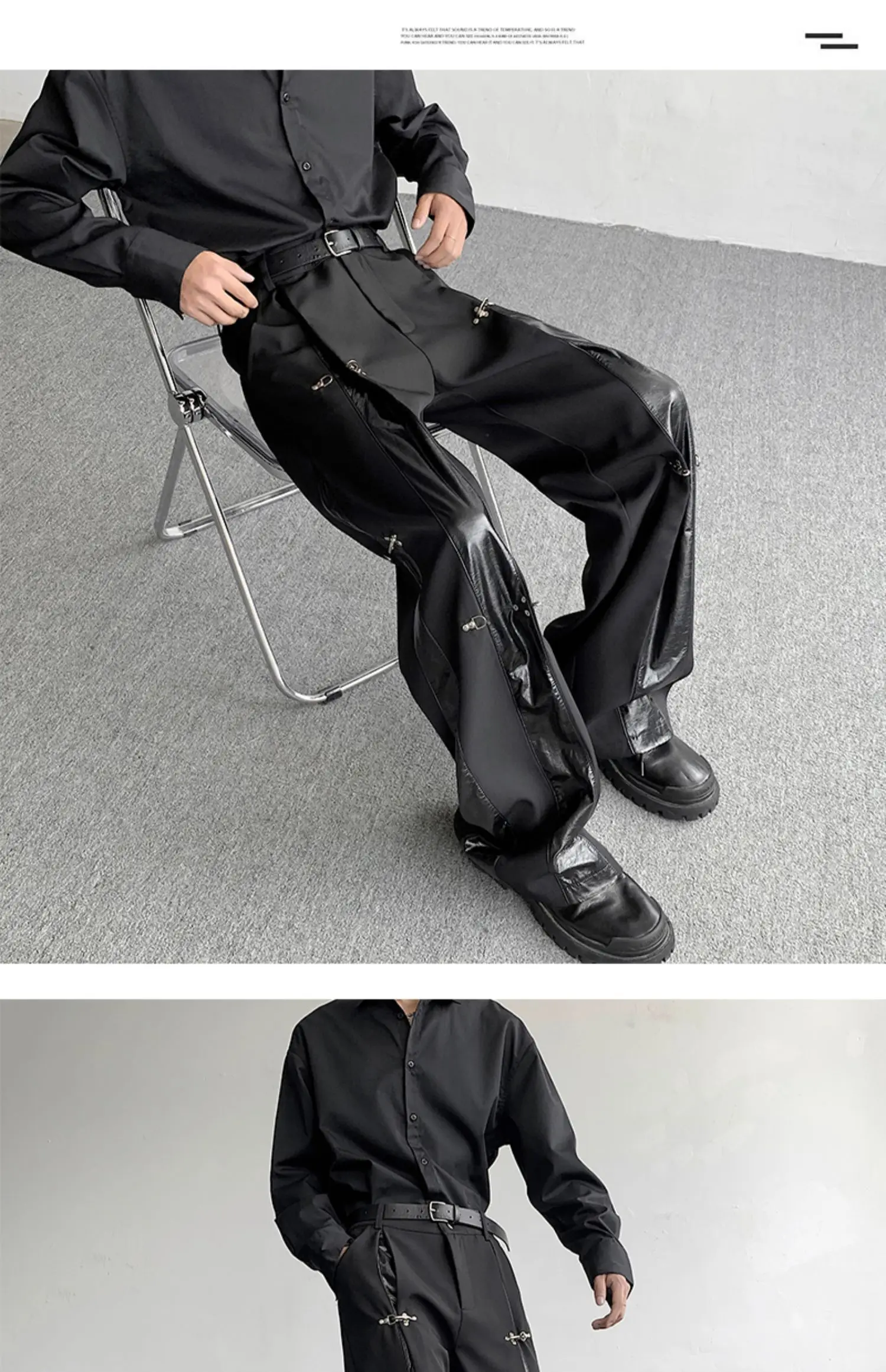 Men's Pants Autumn Winter Metal Buckle Design PU Leather Splicing New Fashion Solid Color Darkwear Trousers