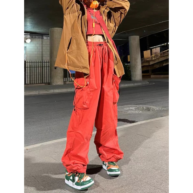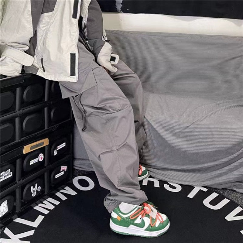 Men's parachute-style hip-hop street overalls oversized pocket trousers Harajuku loose solid color casual pants Y2K legged pants