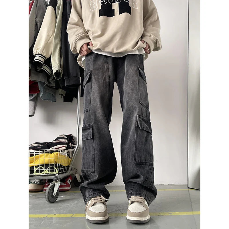 Men's Patchwork Blue Cargo Jeans Unisex Straight Casual Trousers Men Muti-pockets Hip Hop Streetwear 90s Vintage Fashion Pants