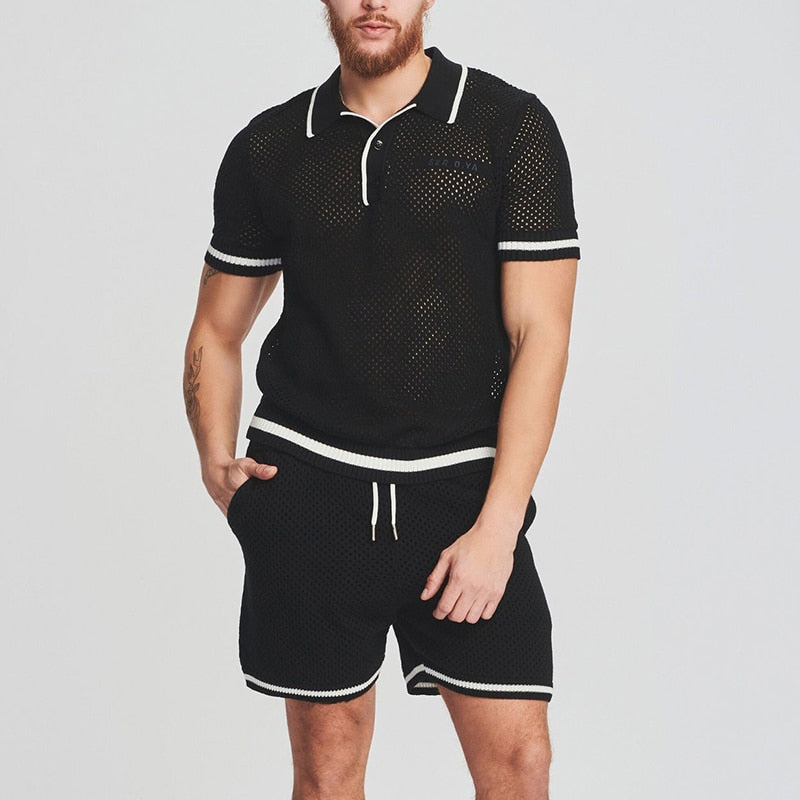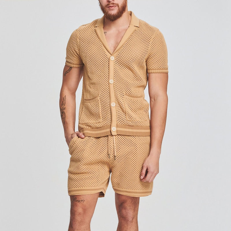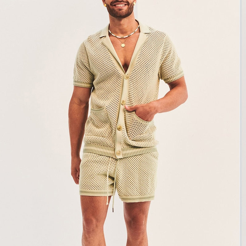Men's Two-piece Set Knit Solid Color Hollow Out Suit Short Sleeve Lapel Pocket Top Drawstring Shorts New Fashion