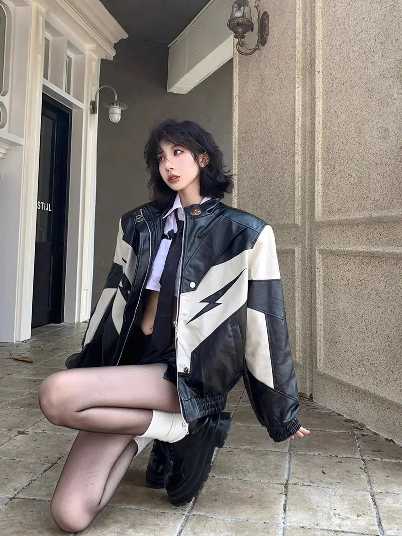 Motorcycle Jacket Men Women New High Street Vintage American Patchwork Leather Racing Jackets Loose Casual Handsome Coats Unisex