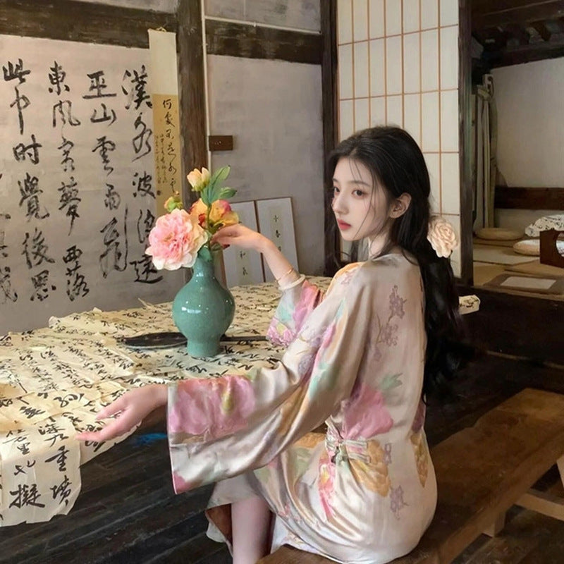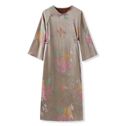 national style new Chinese printing design sense split silk cheongsam dress slim slim dress M6065