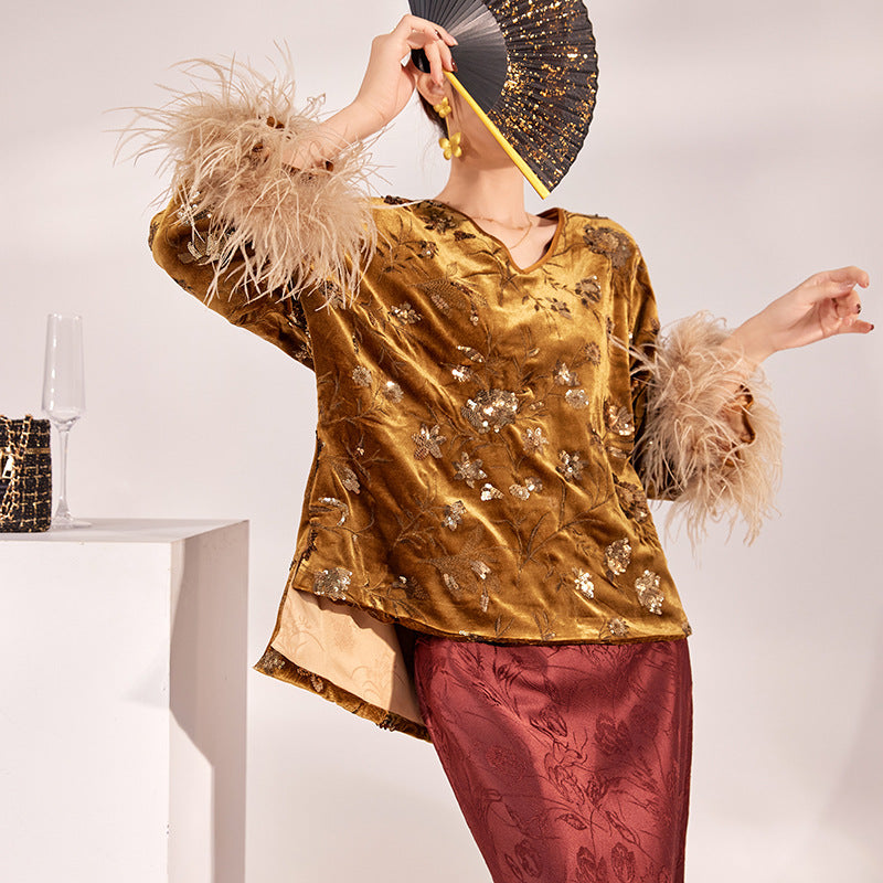 New autumn and winter national style cuffs feather splicing embroidered sequins temperament top skirt set female M9164