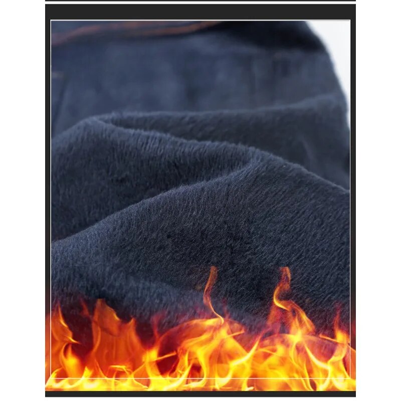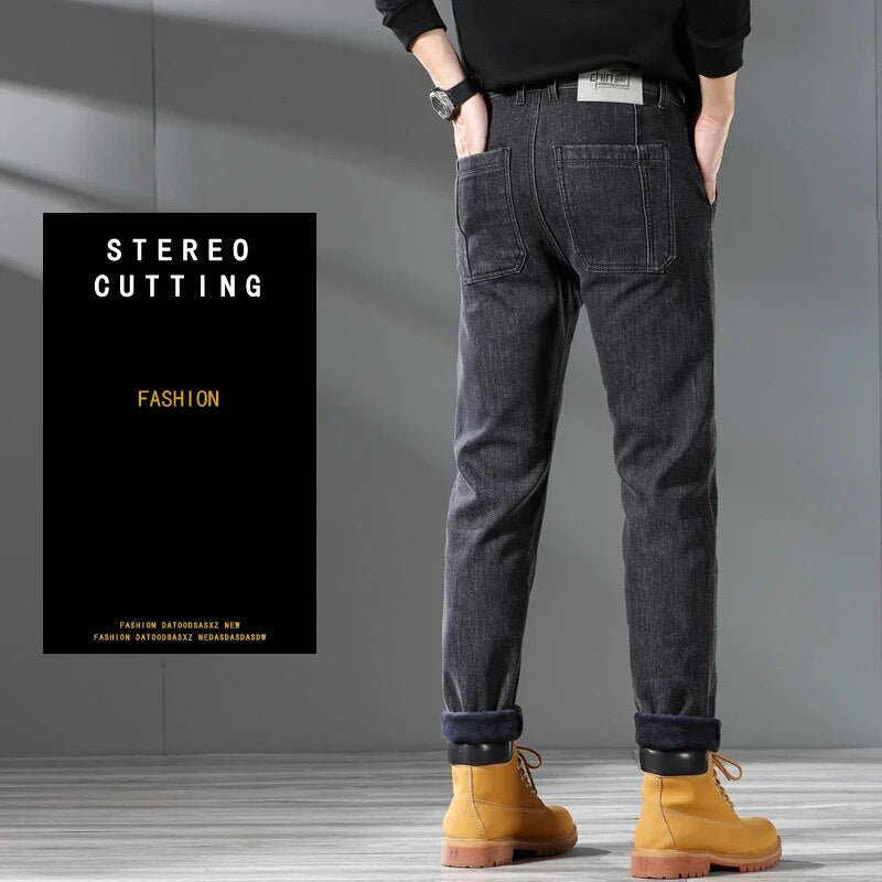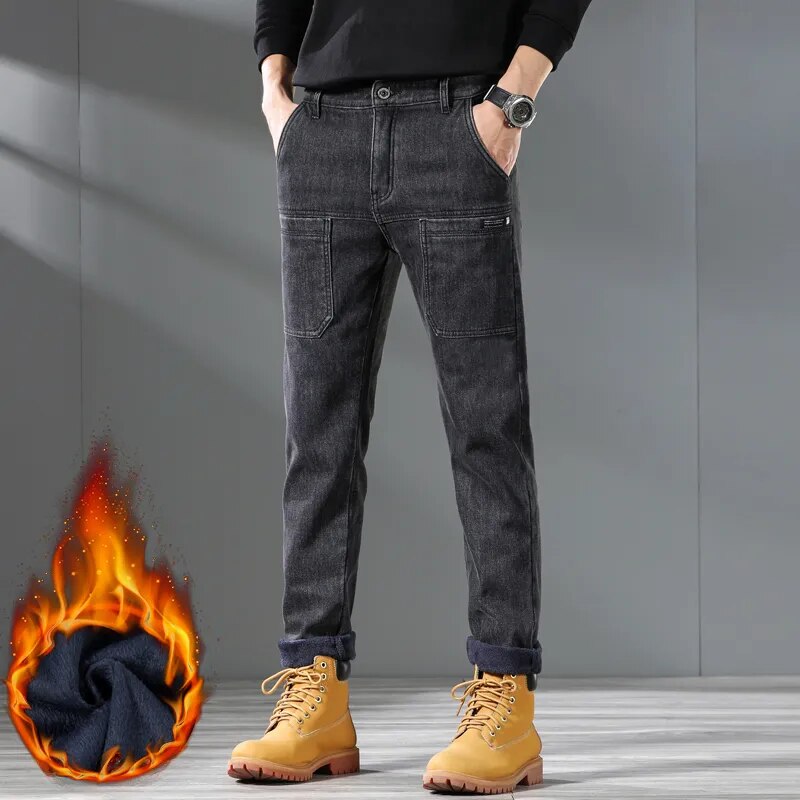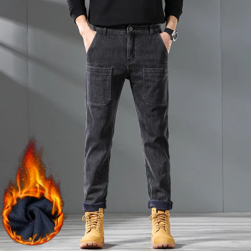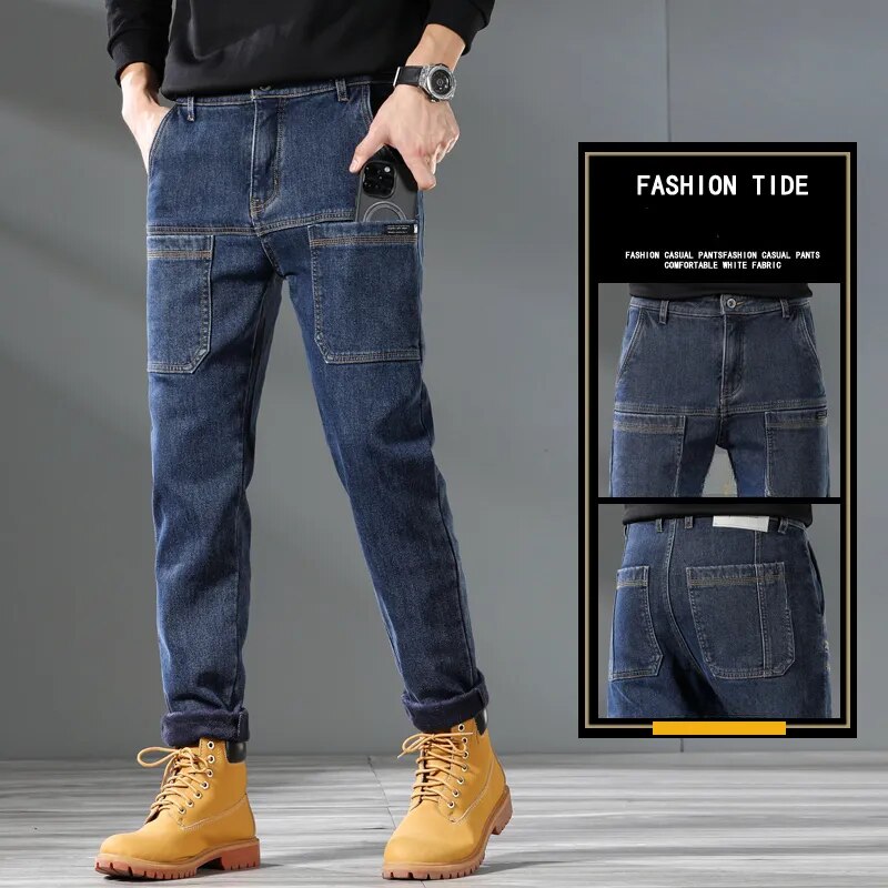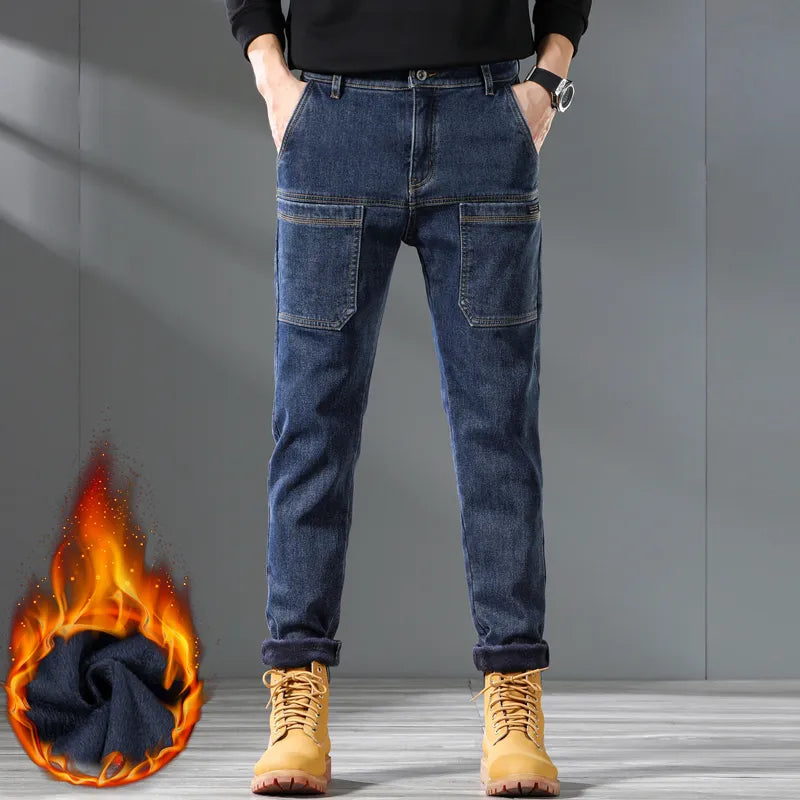 Pocket Design Fleece Men's Jeans Fashion Thick Korean Classic Fashion Slim Plush Pants Male Casual Solid-color Denim Trousers