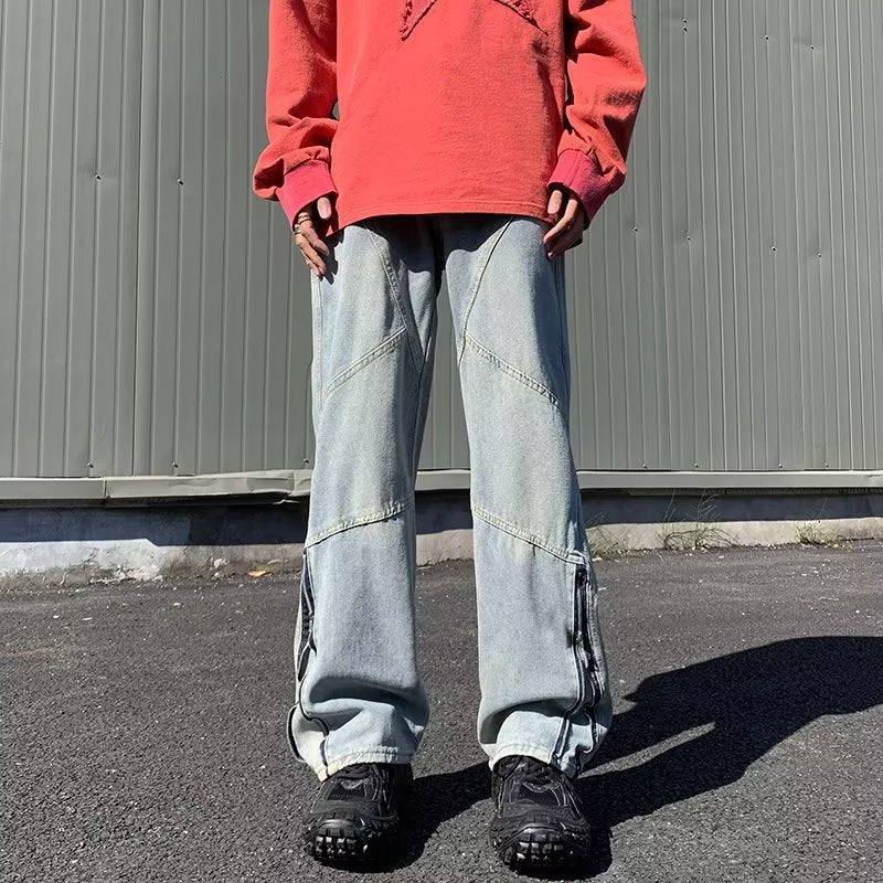 90s streetwear American Retro Zipper Jeans Men's Autumn and Winter 2024 New Washed Straight Flared Pants High Street Vibe