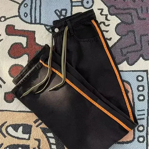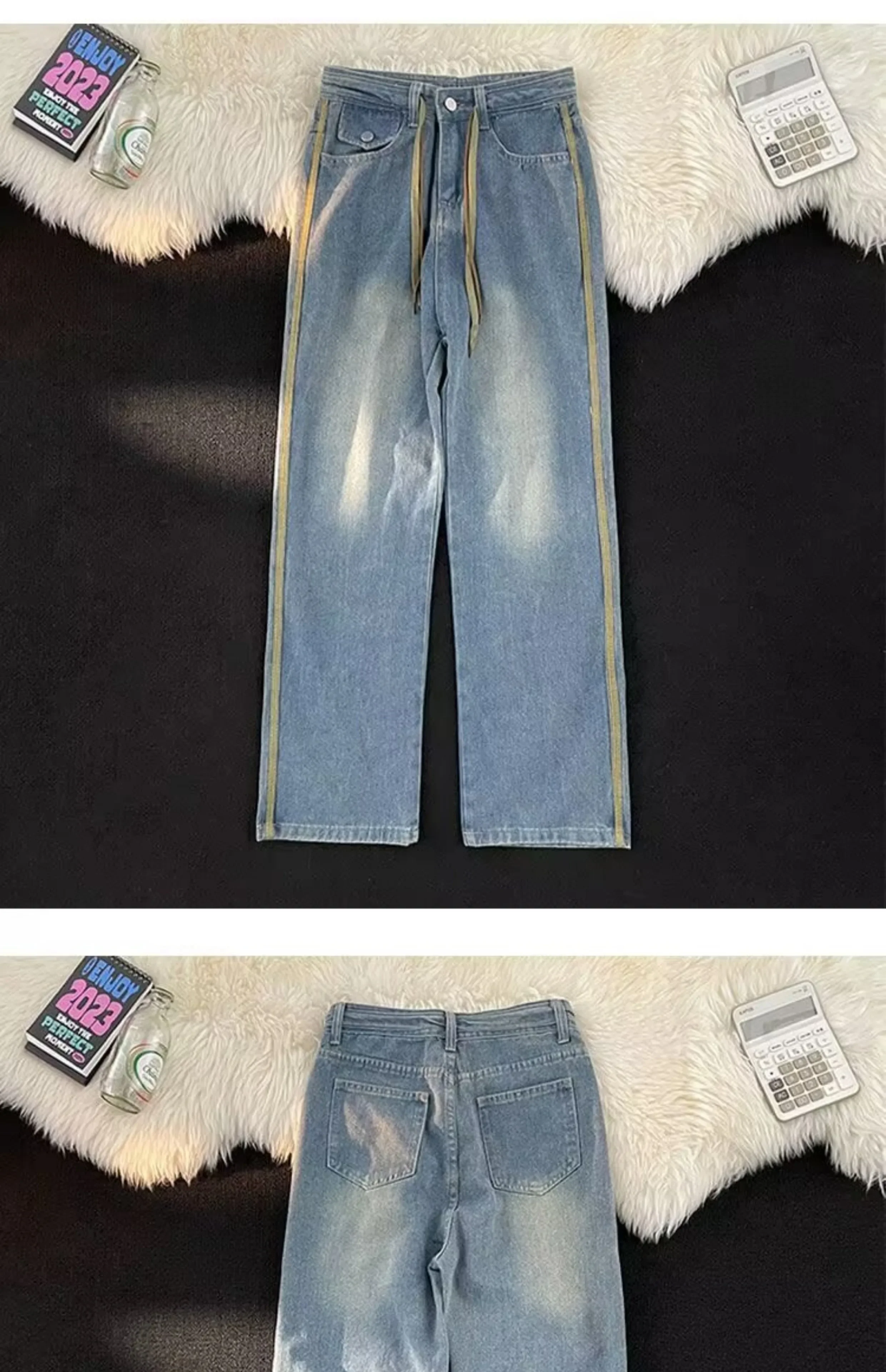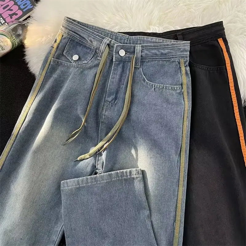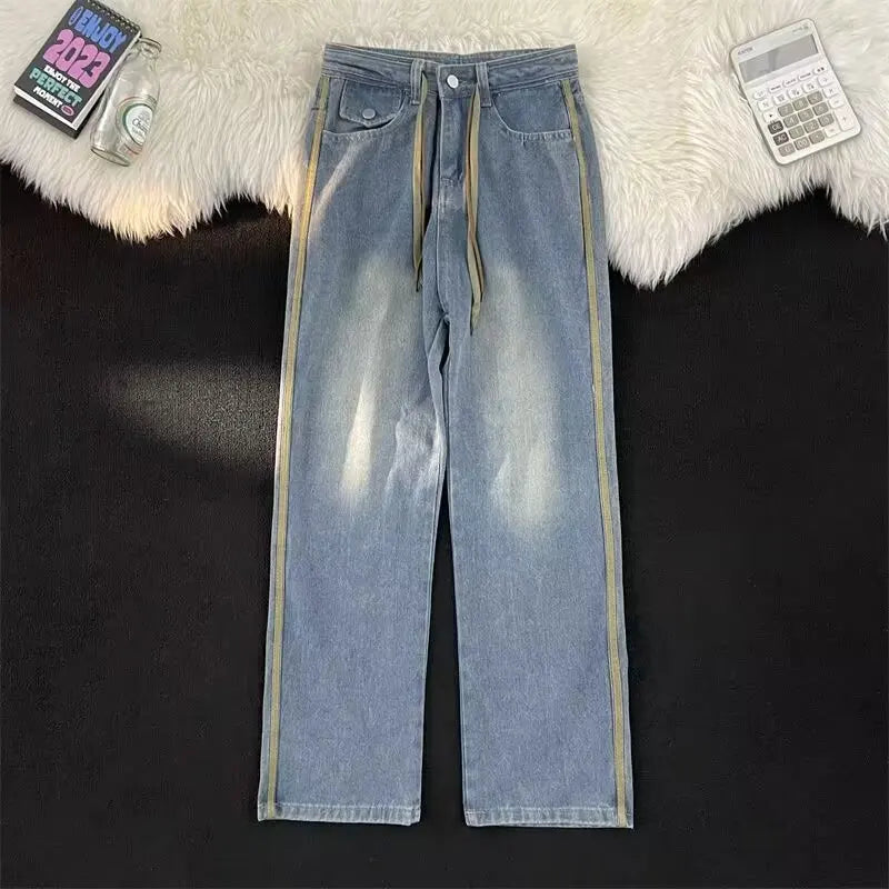 saferido American Retro Drawstring Jeans Men's High Street Causal Loose Straight Draping Wide Leg Pants Men Trousers Male