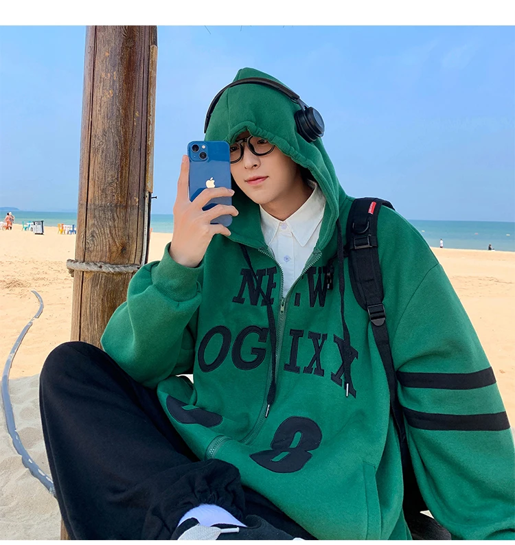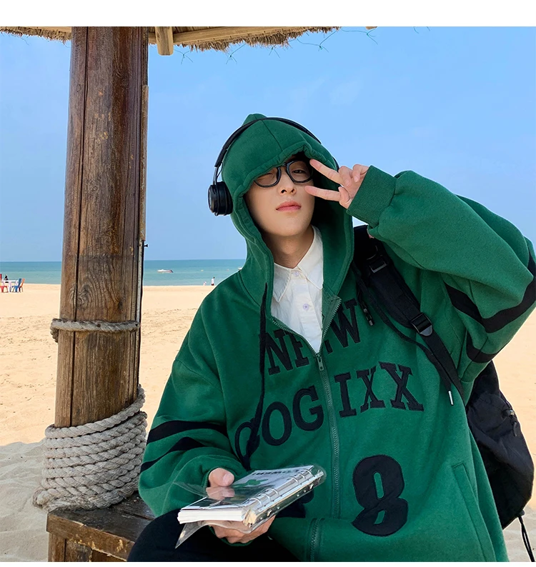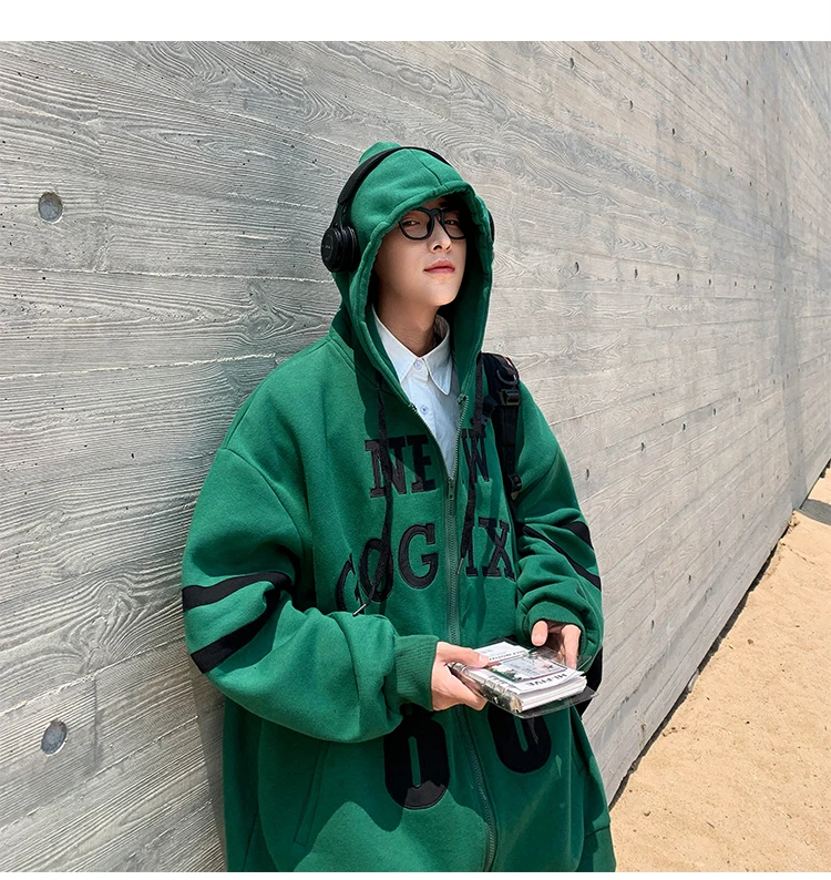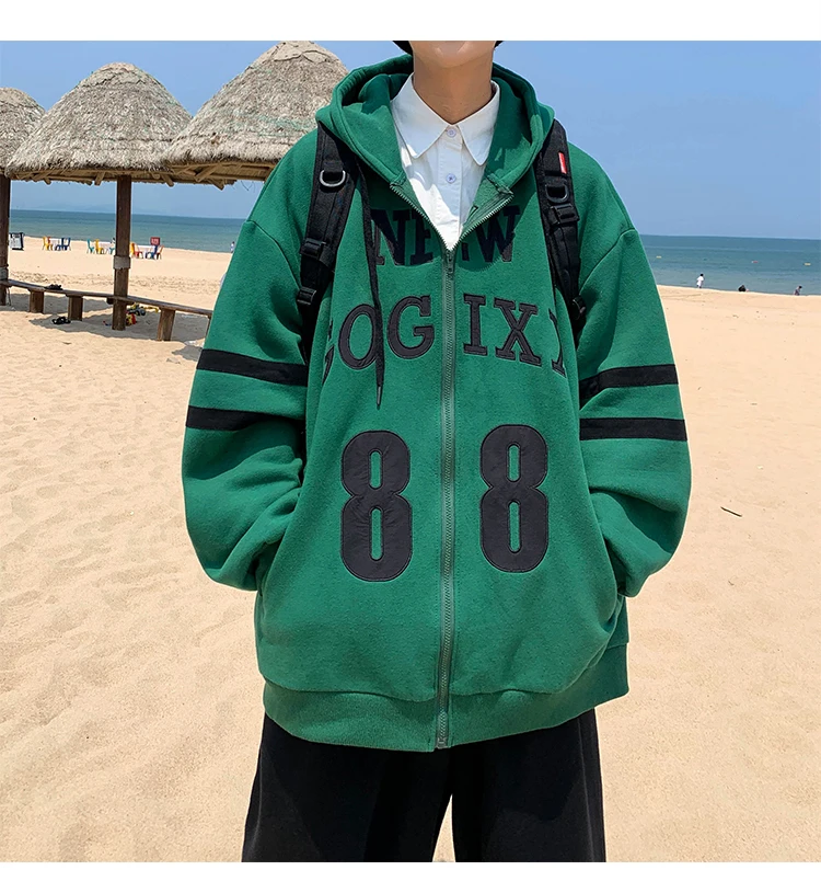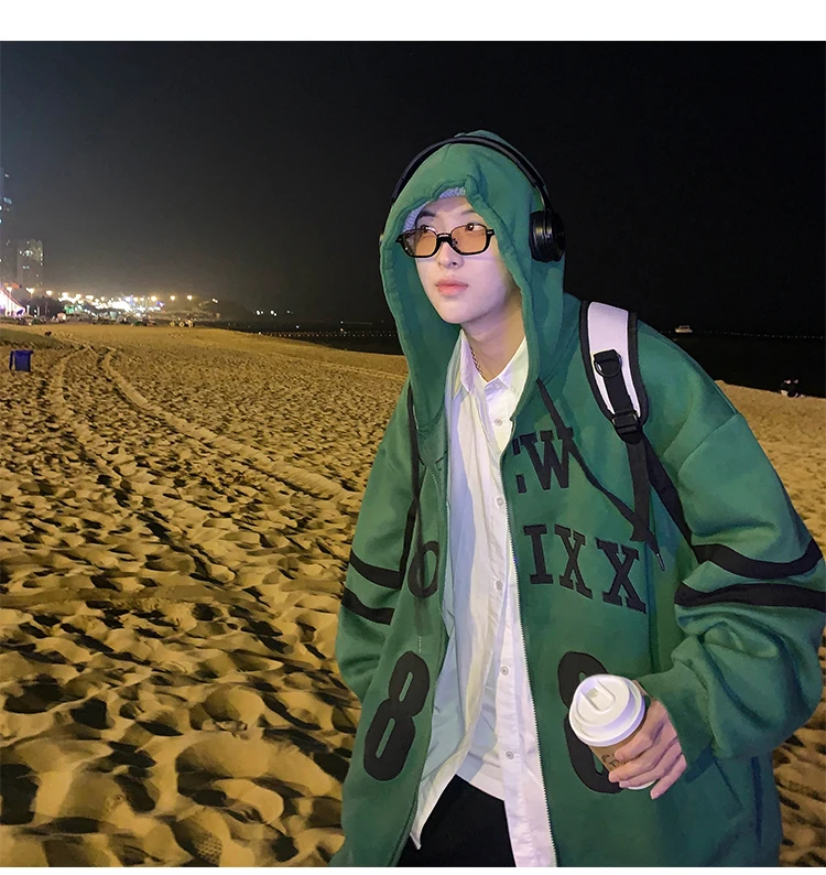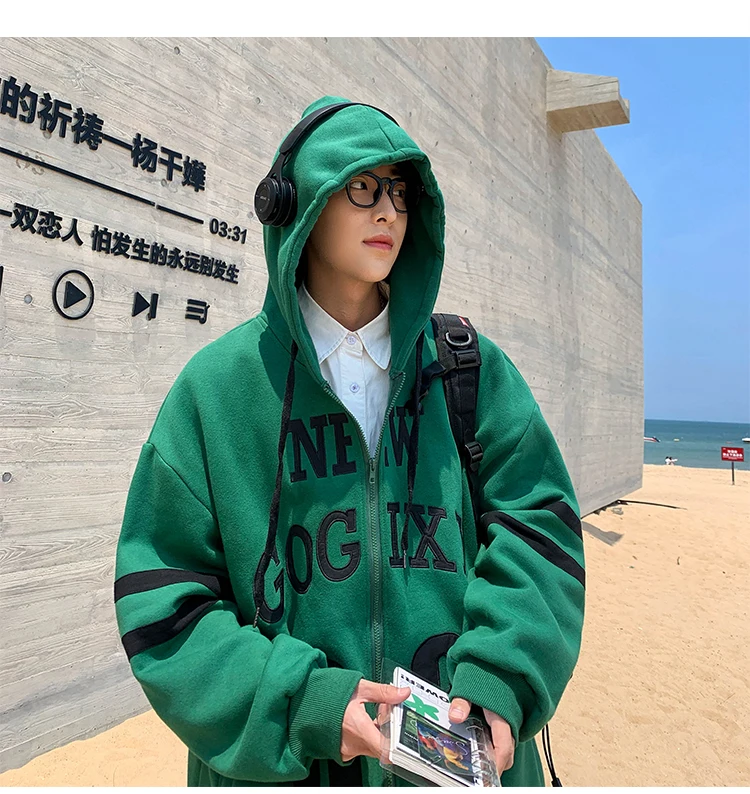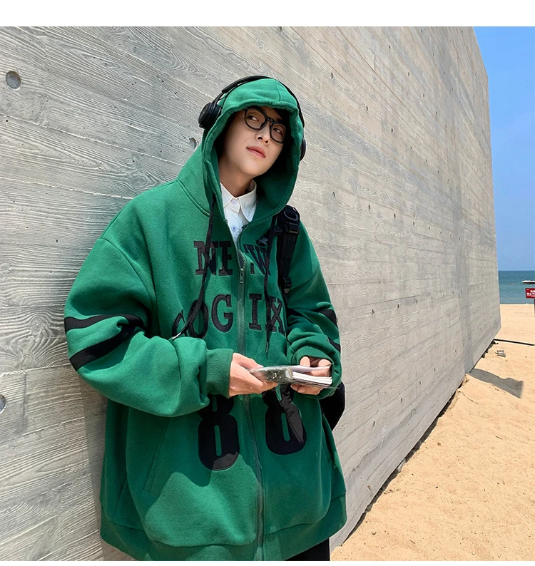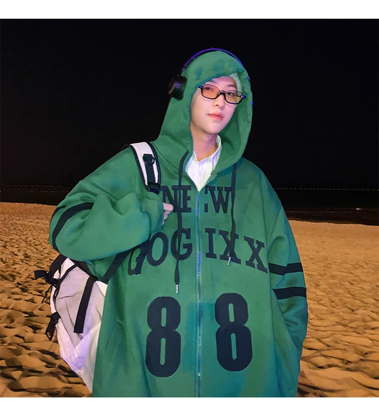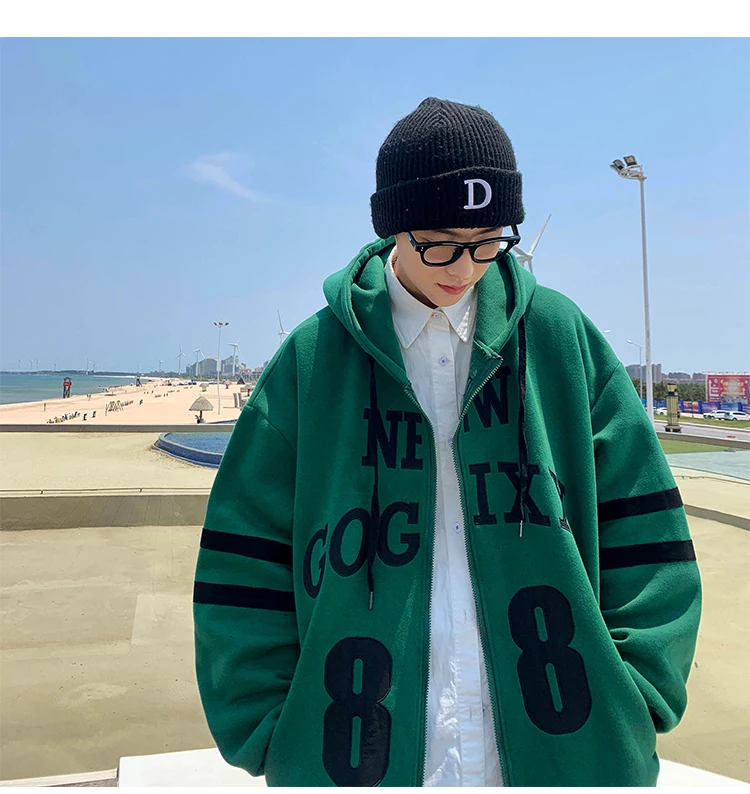 saferido American retro hoodies jacket for men Letter print Hooded Sweatshirt Baggy Zipper Hoodie Coat Green hoodies Men/Women Outwear