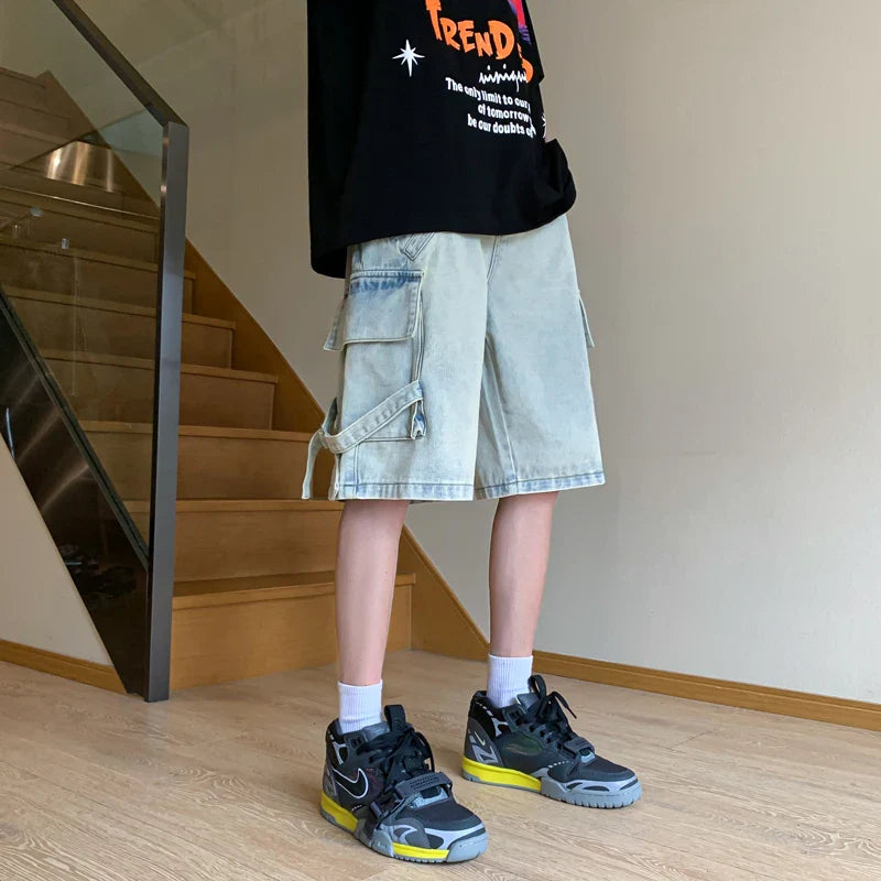 saferido American Retro Tooling Denim Shorts Summer Fashion Design Big Pocket Splicing Wide-leg Cropped Pants Large Size Shorts 4XL 5XL