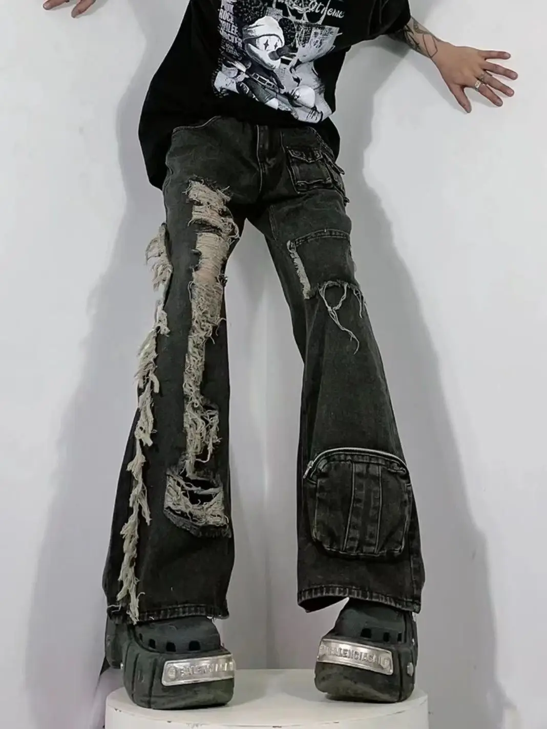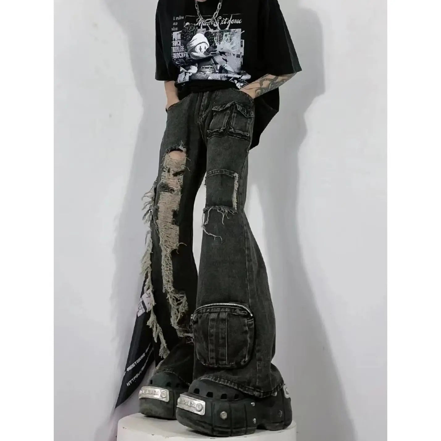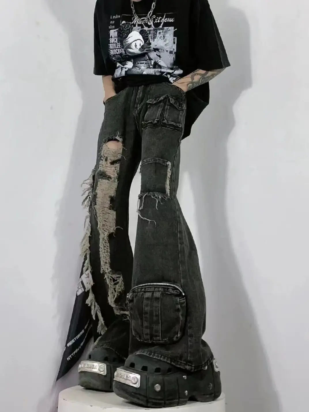 saferido American street hip-hop design washed distressed jeans with multiple pockets for men and women straight leg wide casual pants