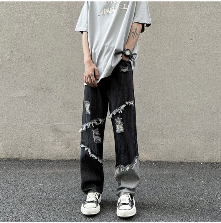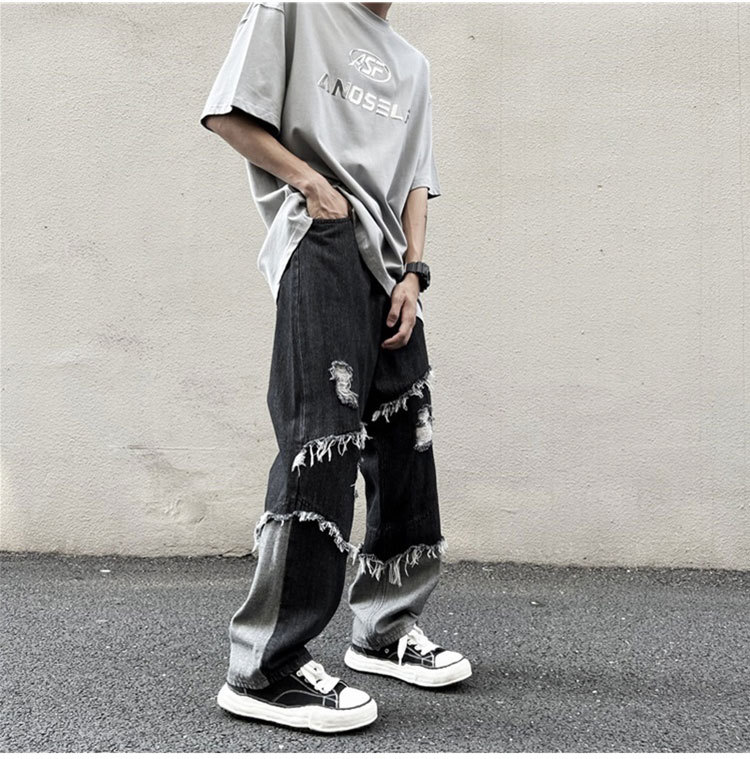 saferido American Style Fringed Denim Pant Tide Small Group Stitching Harajuku Wind Loose Stitching Burr High Street Casual Y2k Pants Men