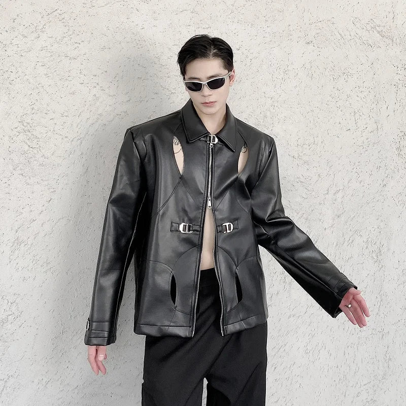 saferido Autumn Korean style Unique ripped hole PU leather jackets for men casual loose metal button PU jackets men,M-XL