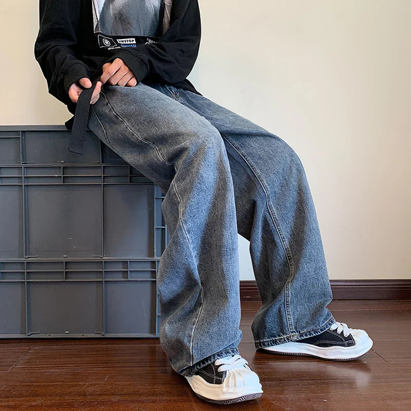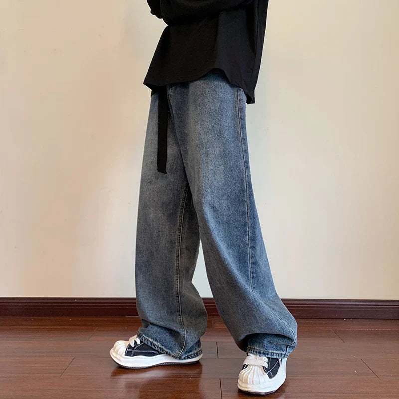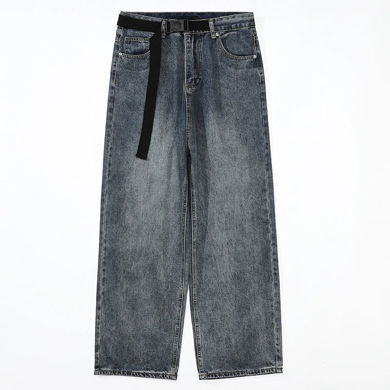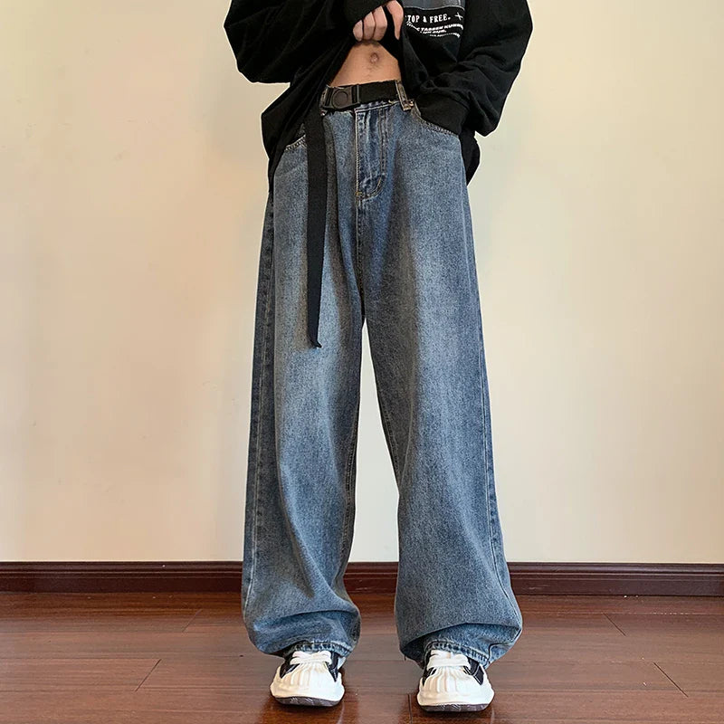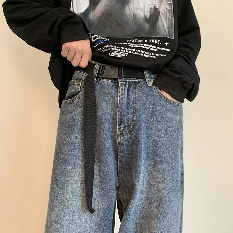 saferido Autumn New Blue Solid Simple Jeans With Belt Male Casual Mopping Denim Pants Men Oversized Zipper Wide Leg Jean Pants