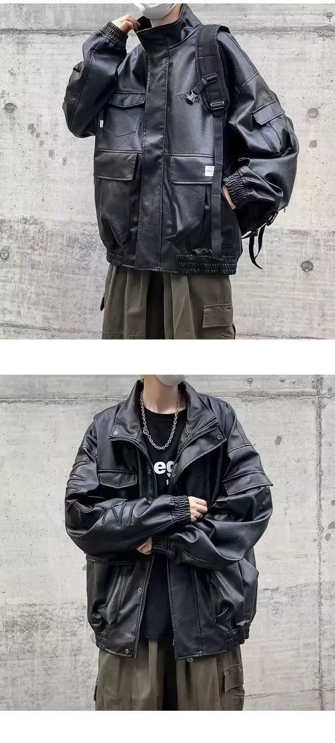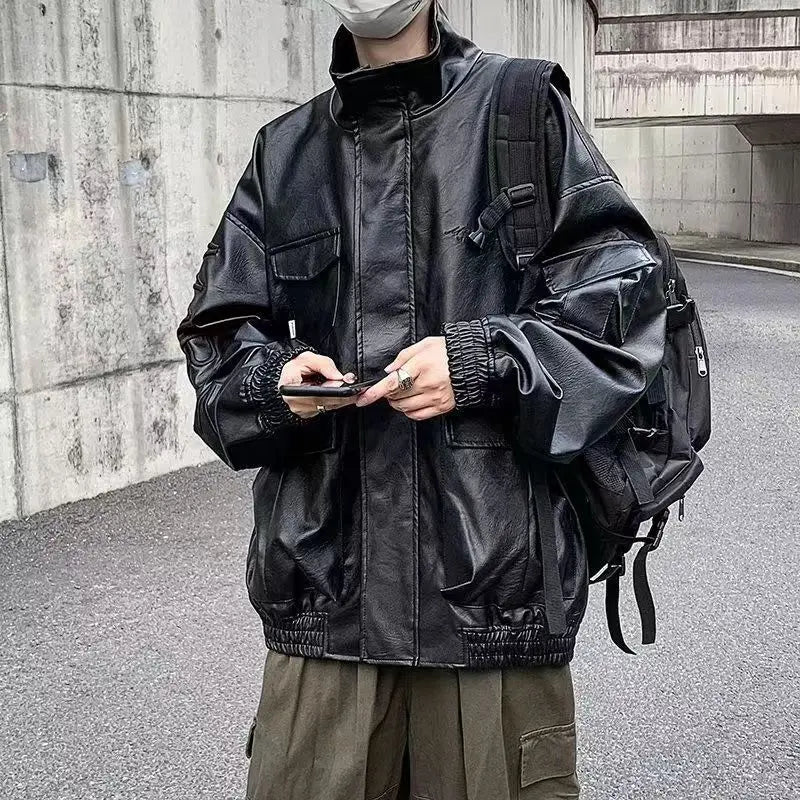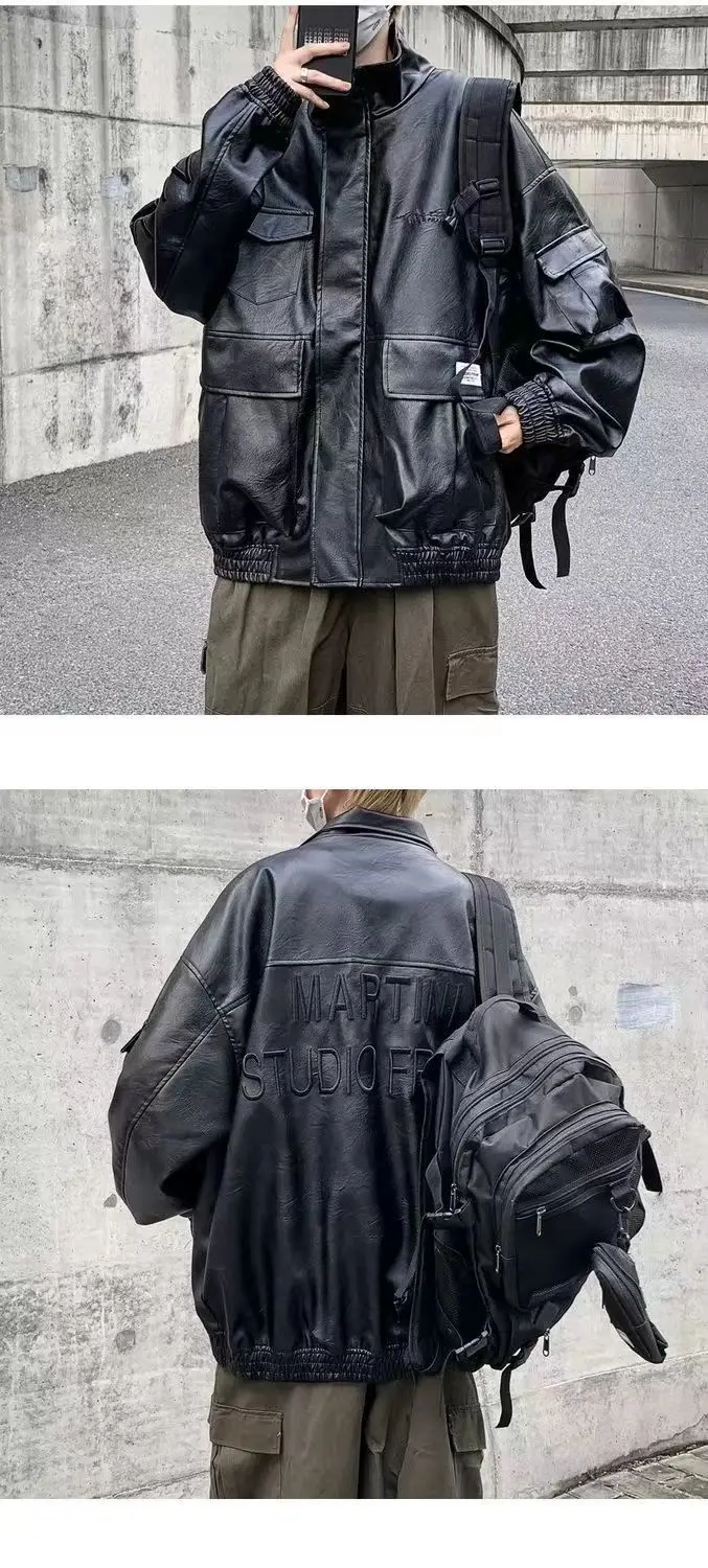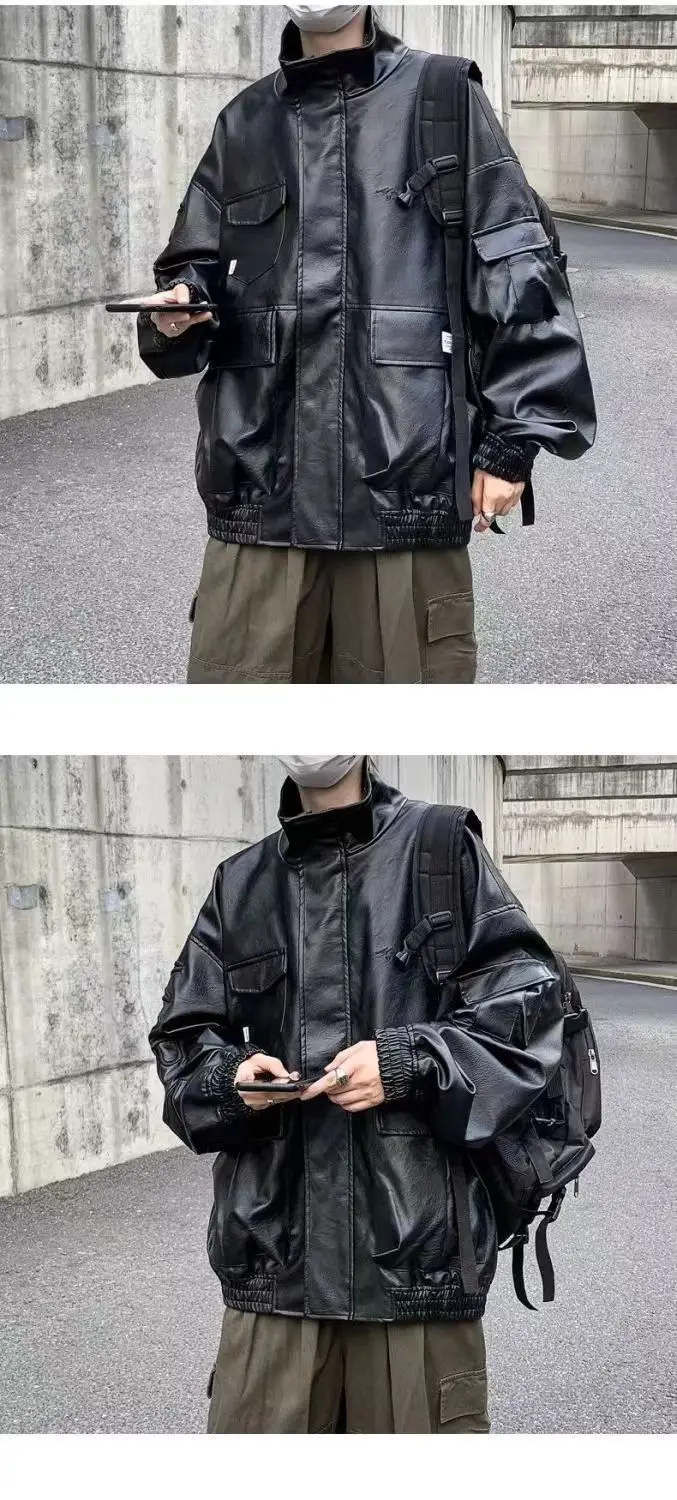 saferido Autumn VIntage Men's Leather Jackets PU Biker Coat Oversized Faux Leather Bomber Jacket 90s Big Pockets Windbreaker Overcoat