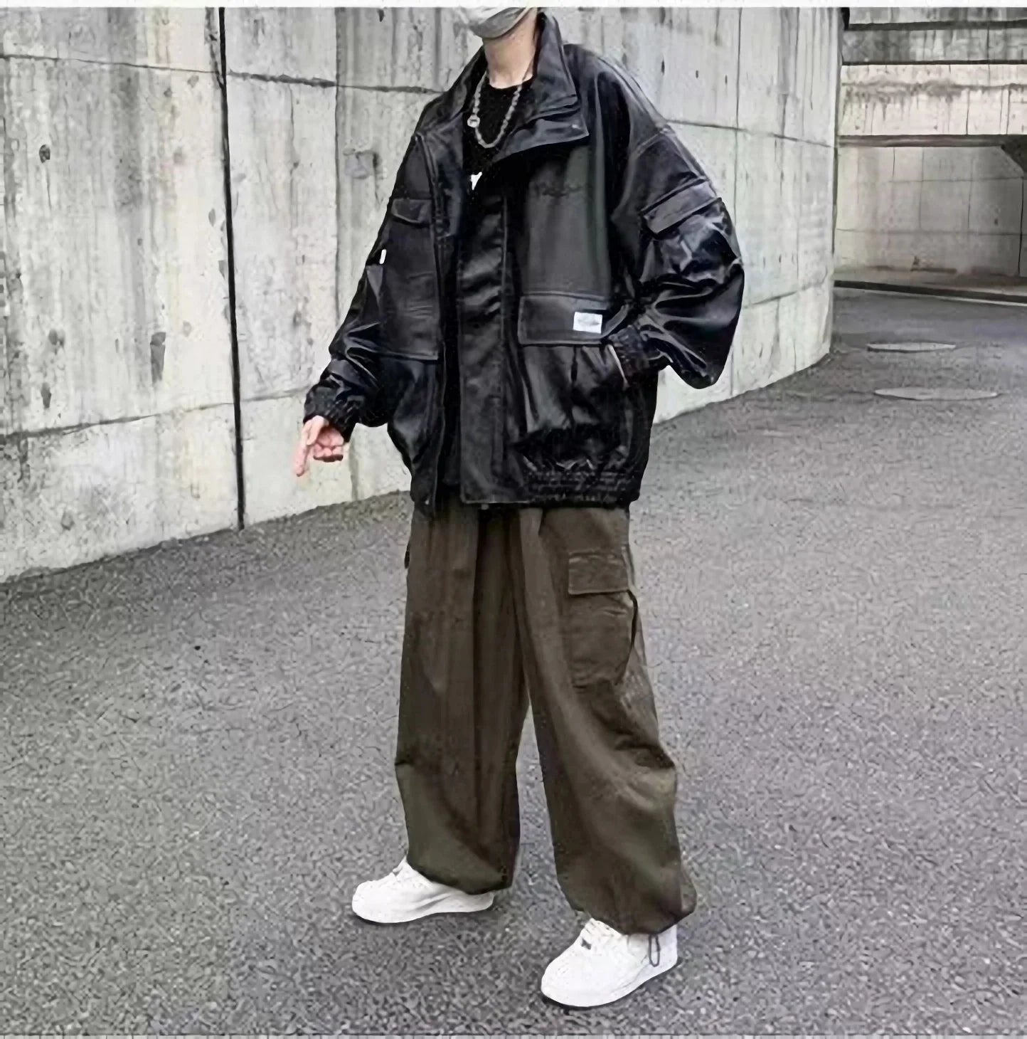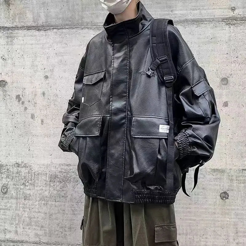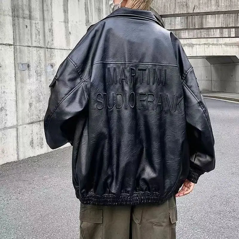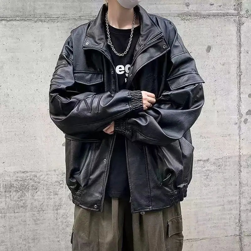 saferido Autumn VIntage Men's Leather Jackets PU Biker Coat Oversized Faux Leather Bomber Jacket 90s Big Pockets Windbreaker Overcoat