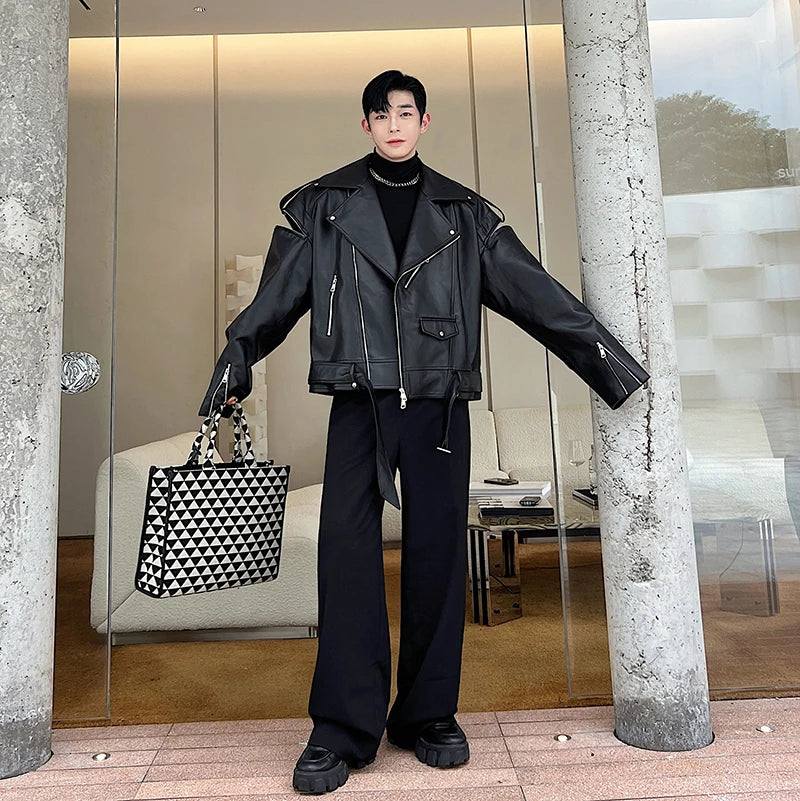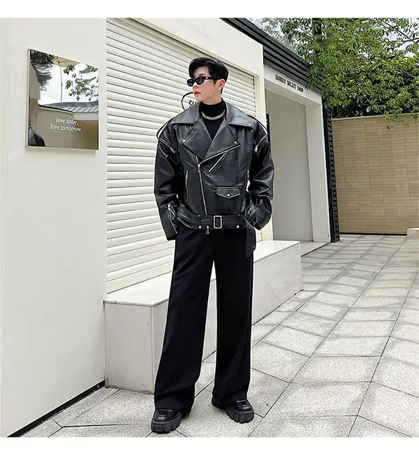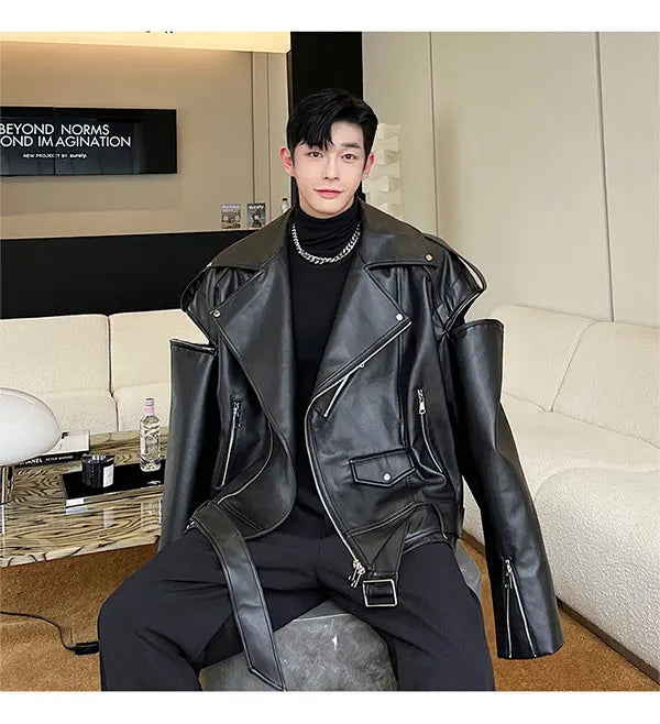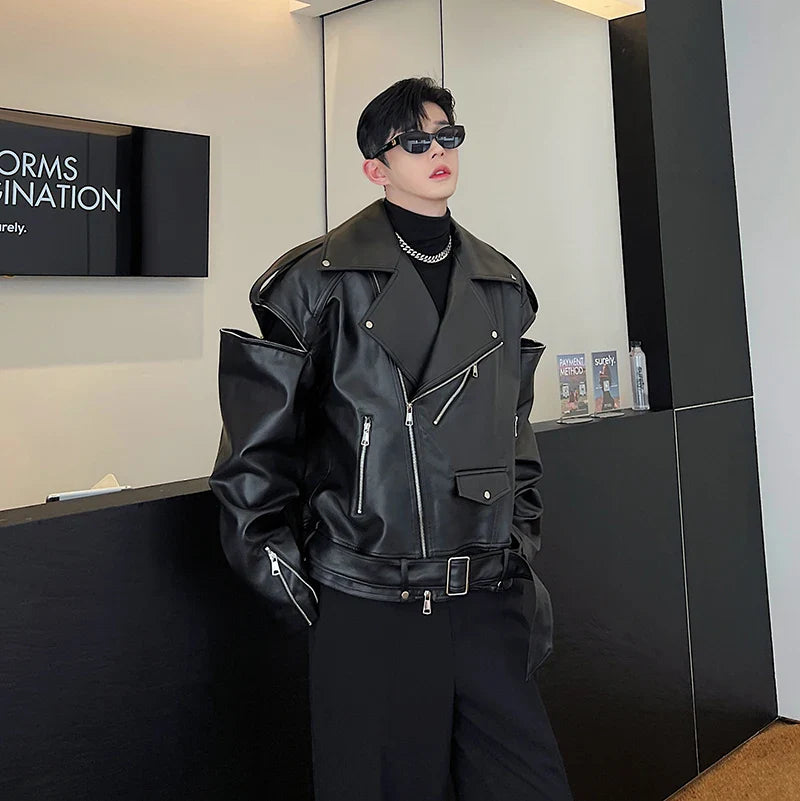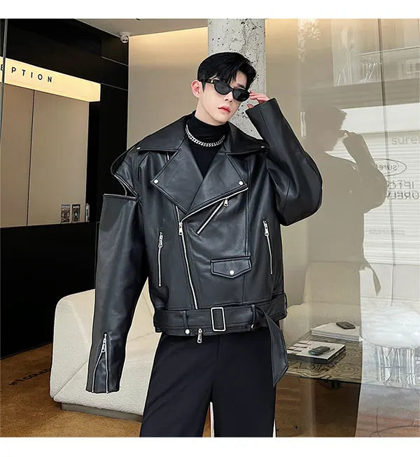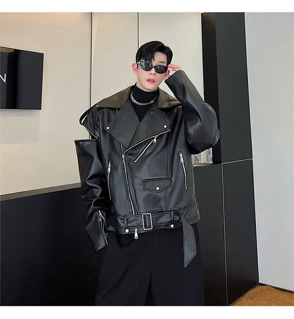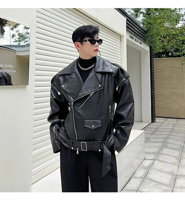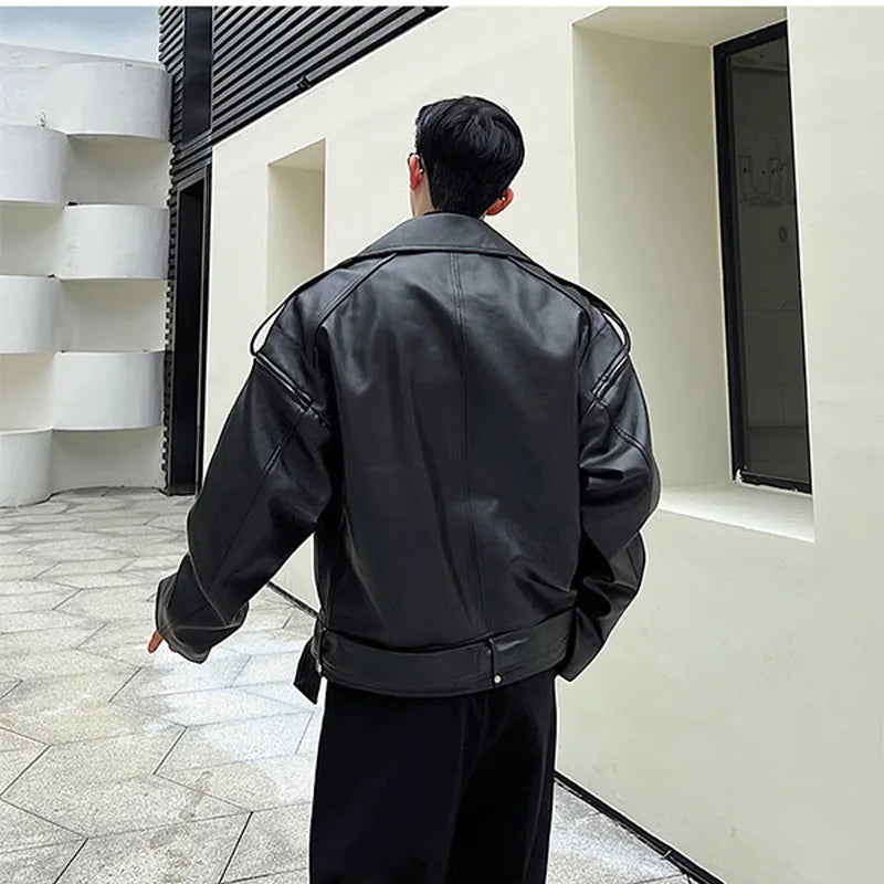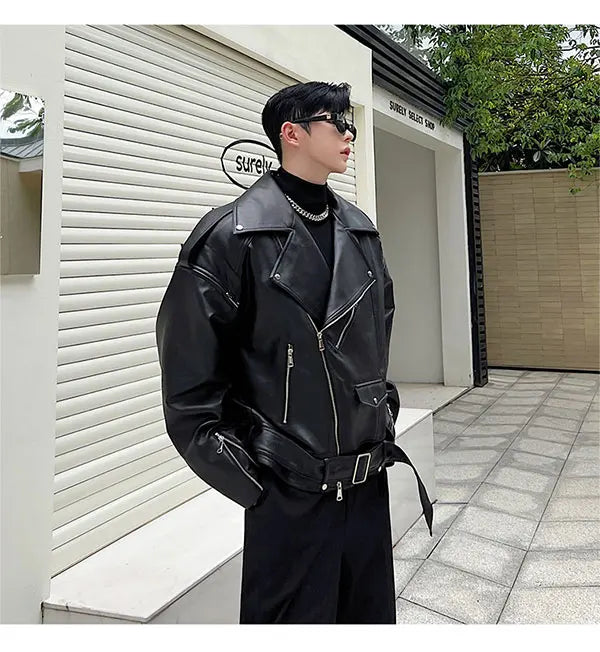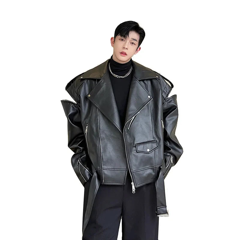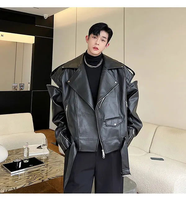 saferido Autumn Winter Wide Shoulder Zipper Leather Jacket Luxury Men Streetwear Loose Vintage Punk Motorcycle Jacket Korean Fashion Coat