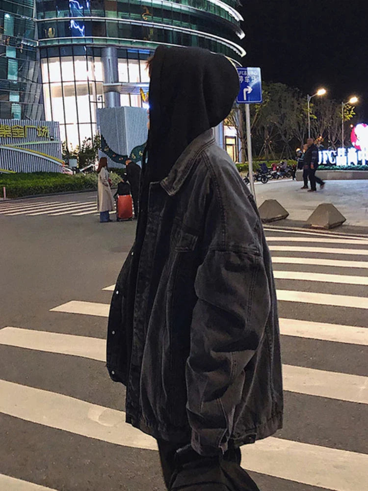 saferido Black Denim Jacket Men's Autumn Handsome High Street Retro Big Pocket Tooling Coat Hong Kong Style Oversize Jeans Top