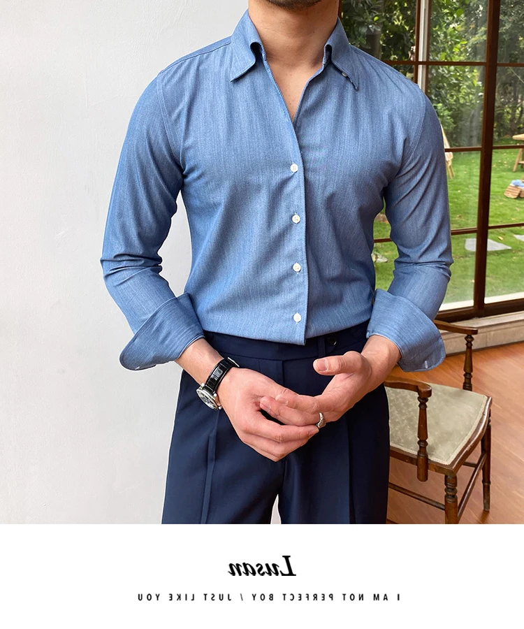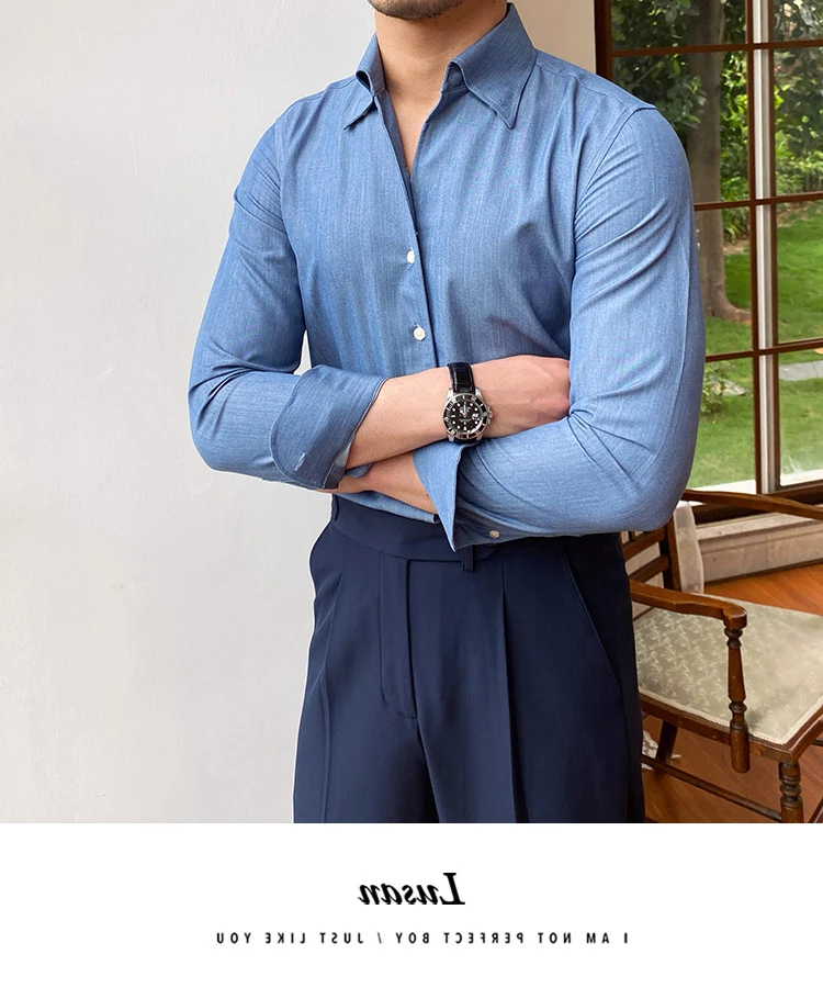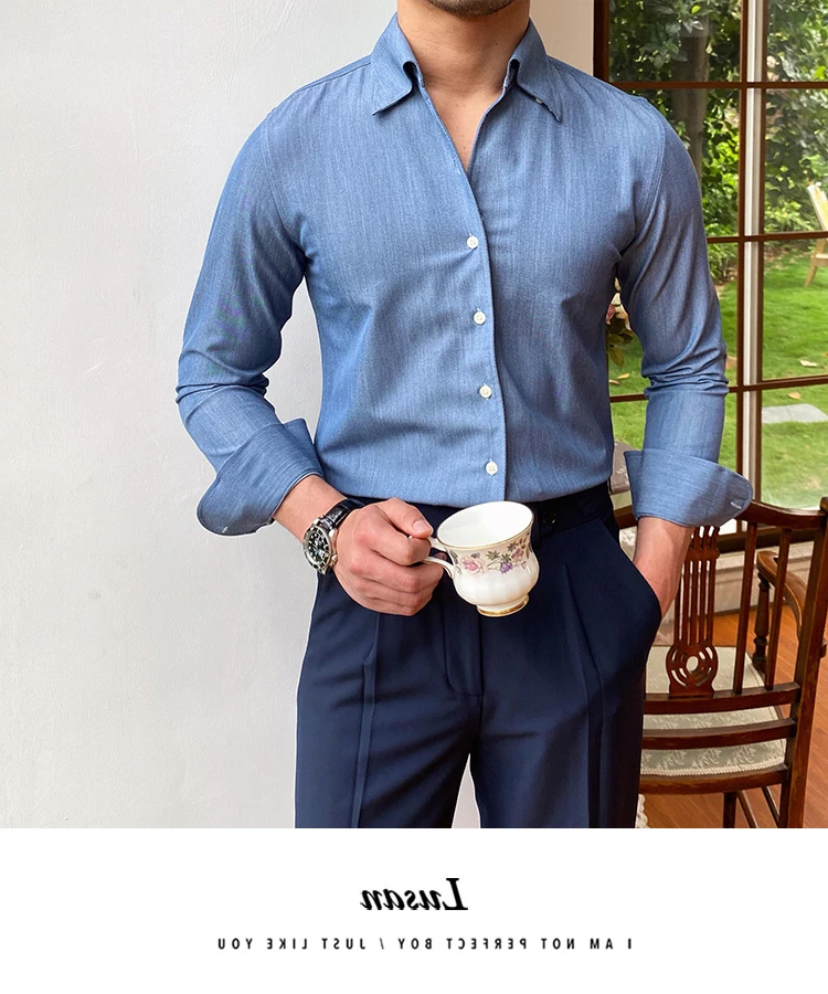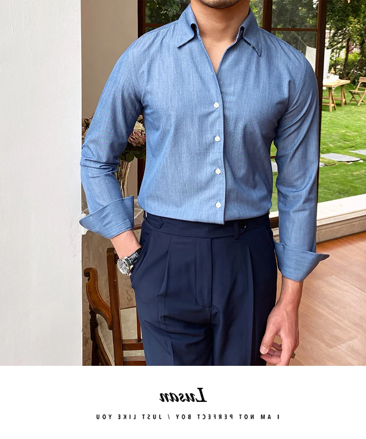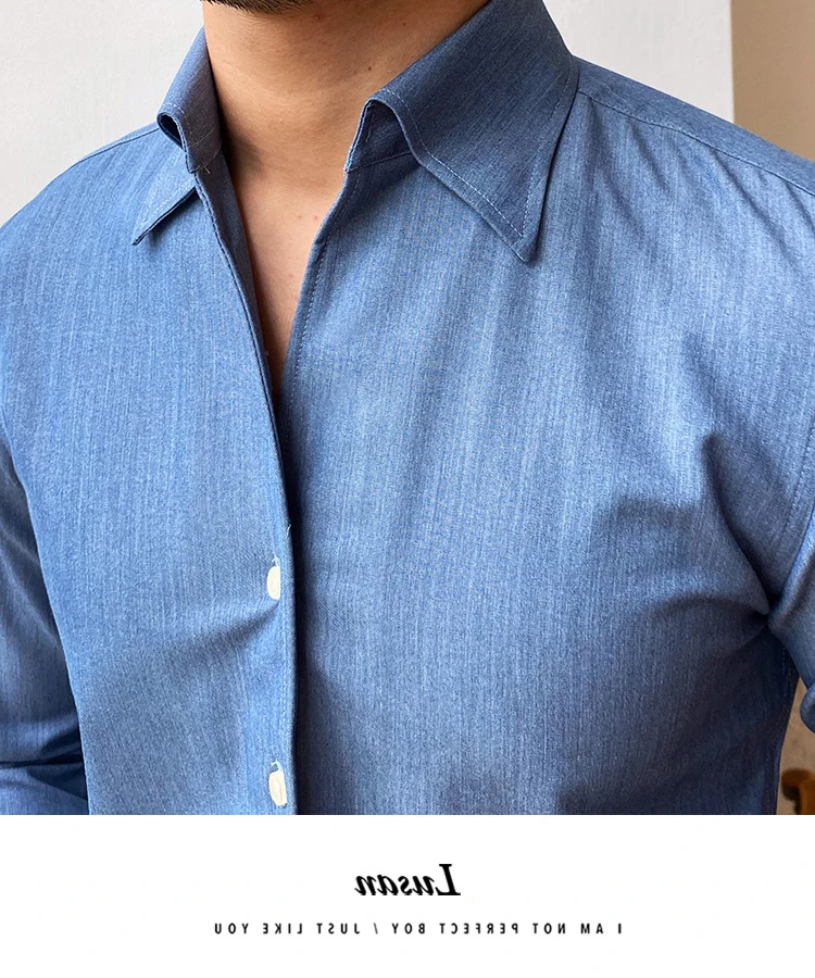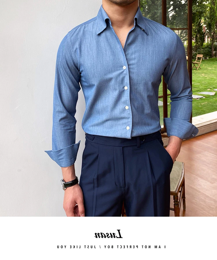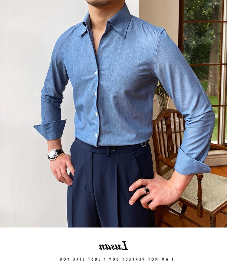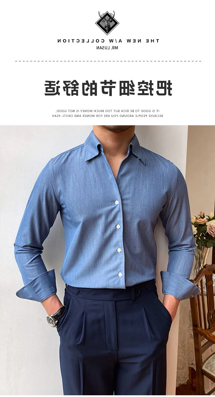 saferido British Style Casual All-match Solid Color Summer Shirt Trendy Denim Blue Business Formal Dress Shirt Long Sleeve Shirt Men