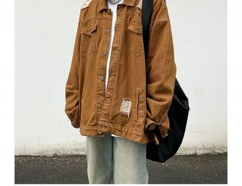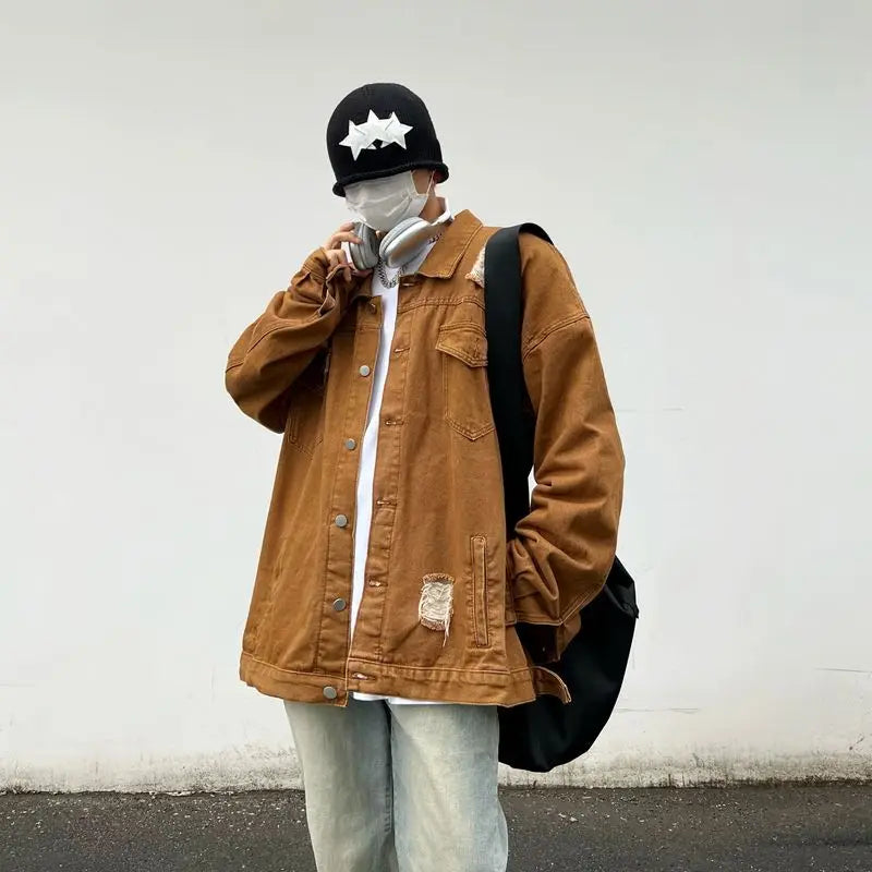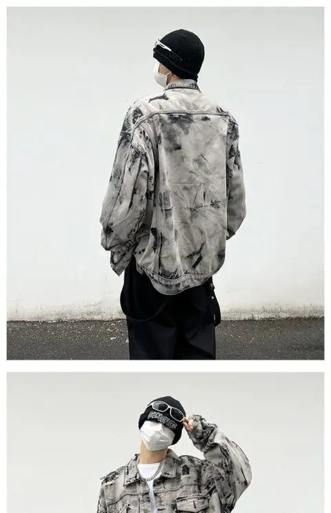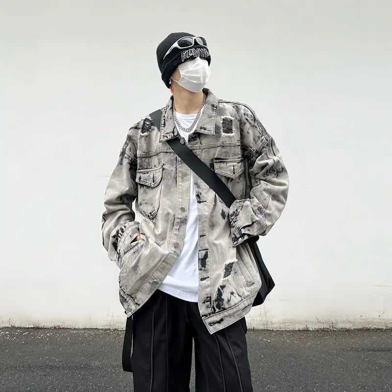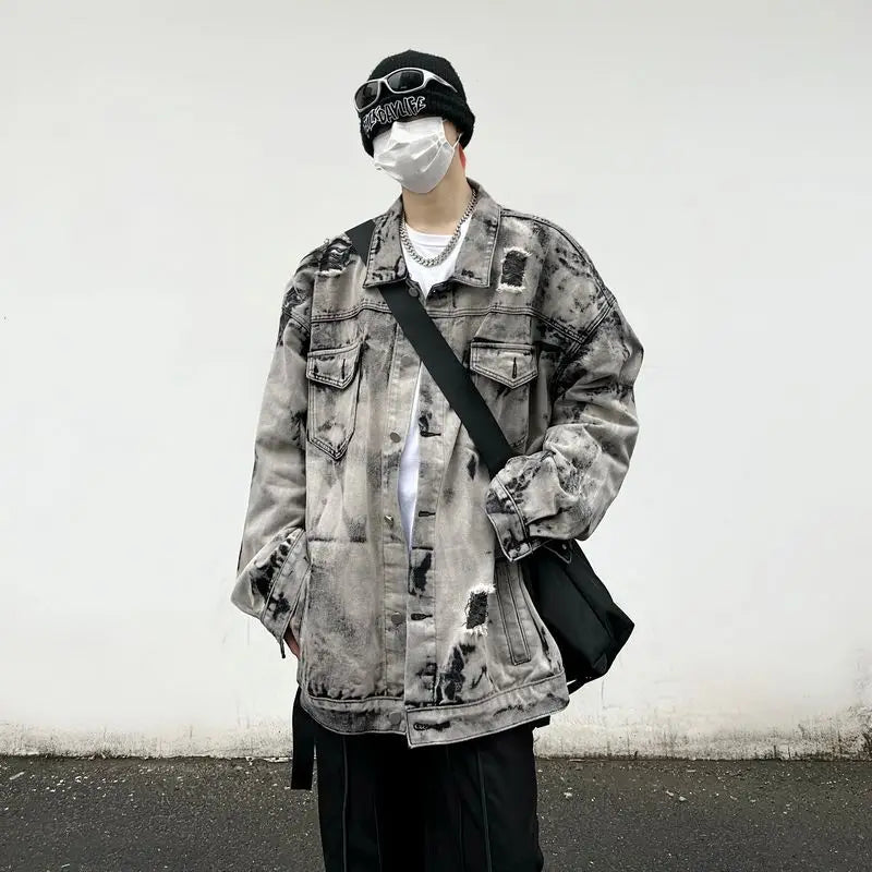 saferido Casual Tie Dyed Coat Men's Broken Hole High Street Harajuku Fashion Jacket Loose Korean Street Vintage Coat