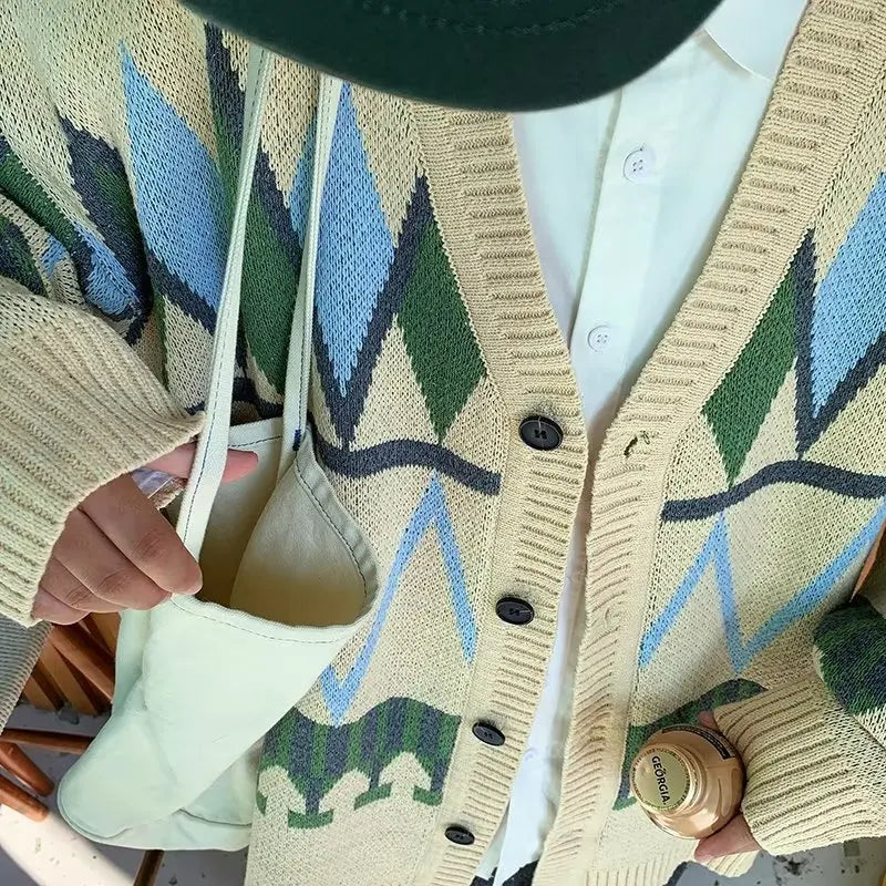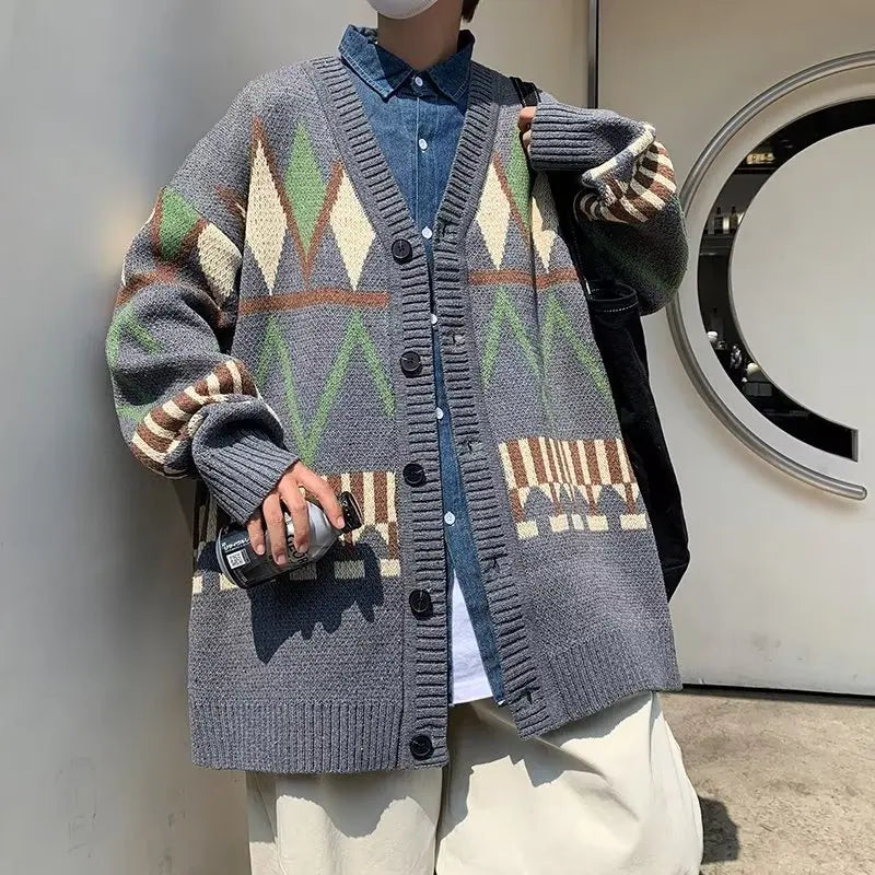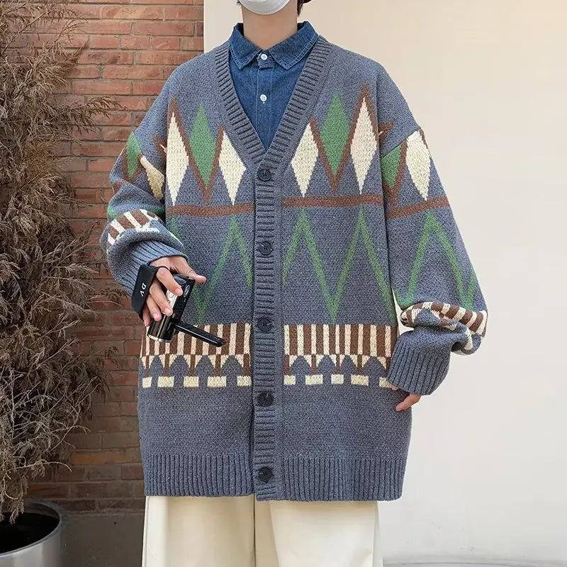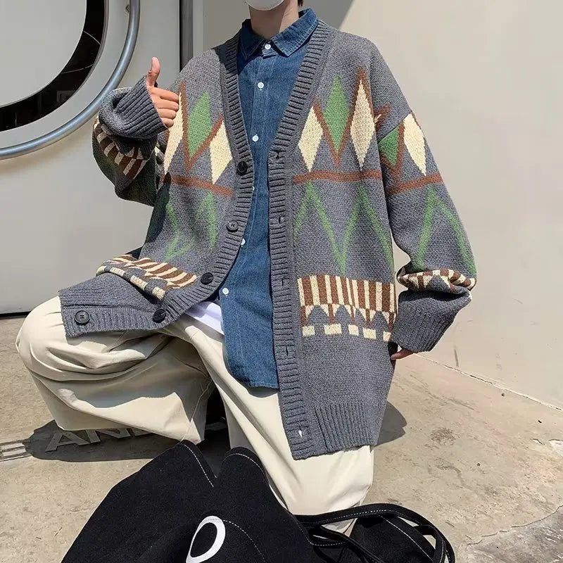 saferido Fashion V Neck Knitted Men Cardigan Sweater Korean Casual Coats Jacket Japanese Trendy Oversized Loose Sweater Mens Cloth
