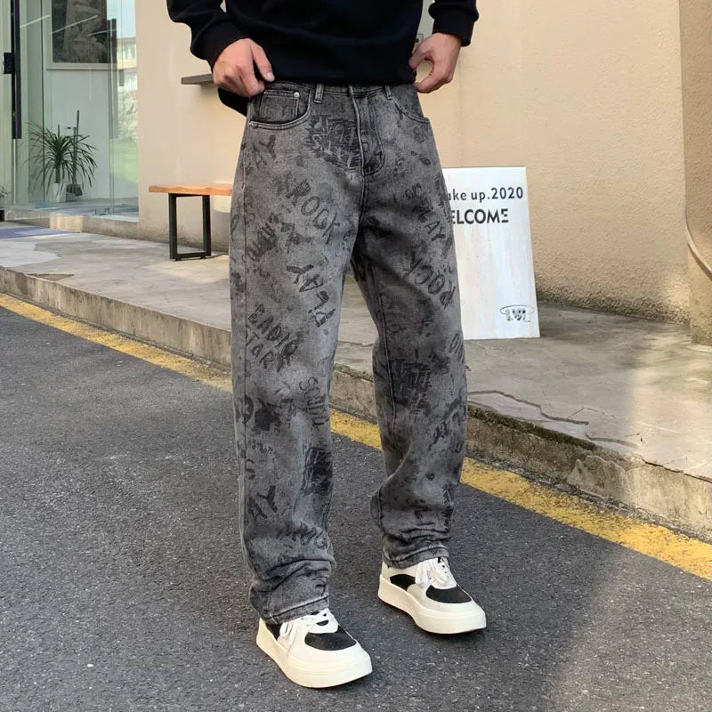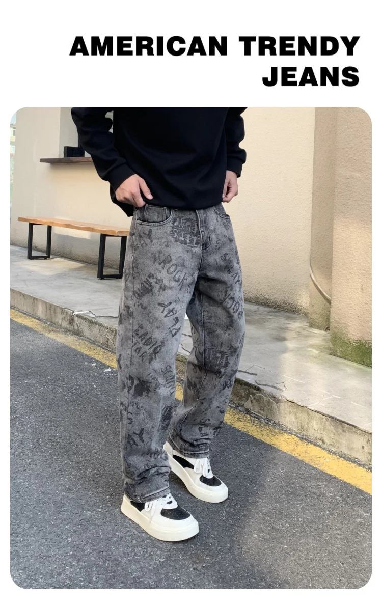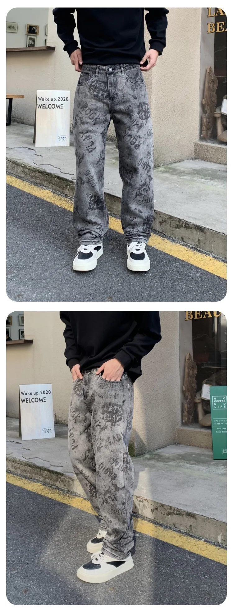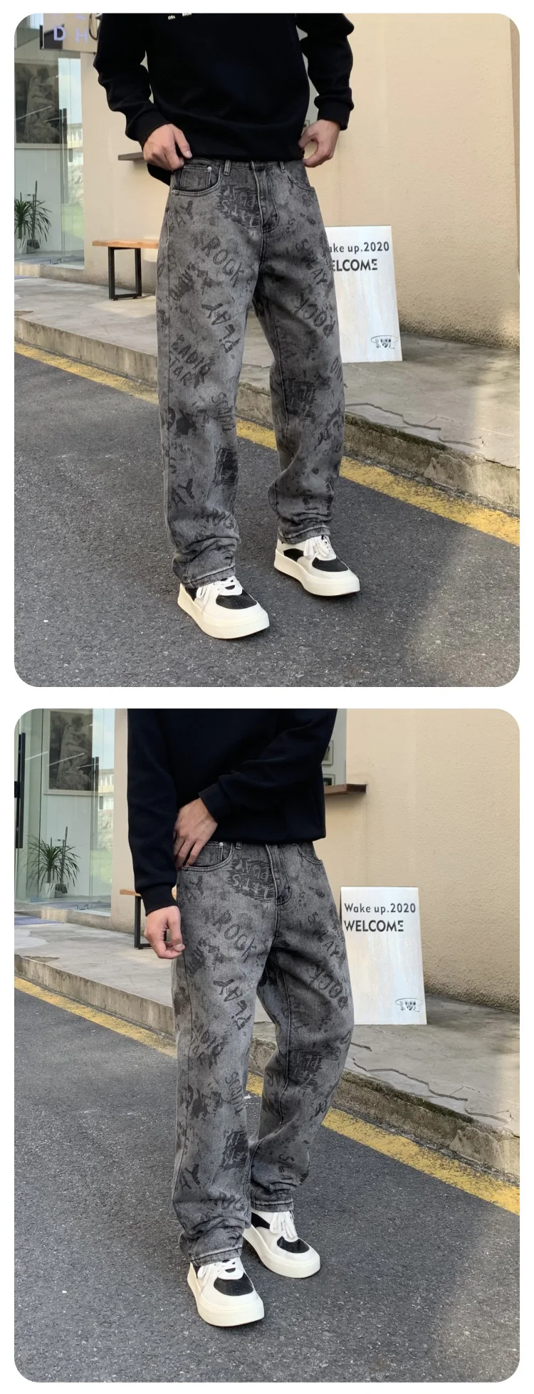 saferido High Quality New Grey Jeans Men Graphic Printed Y2k Denim Trousers Hip Pop Rock Straight Fit Male's Pants
