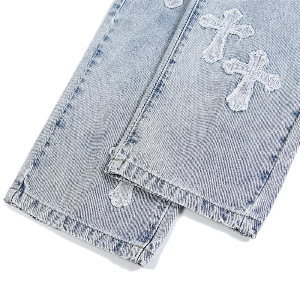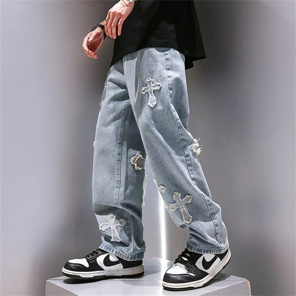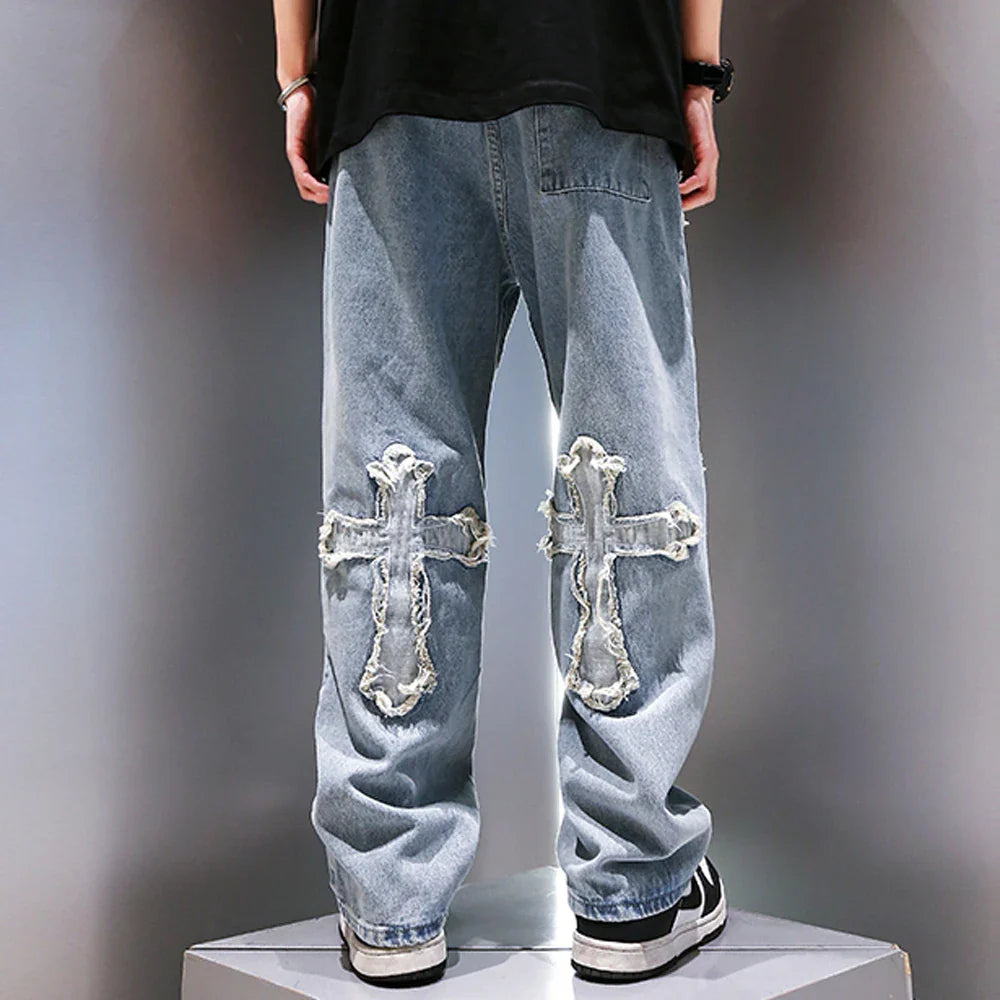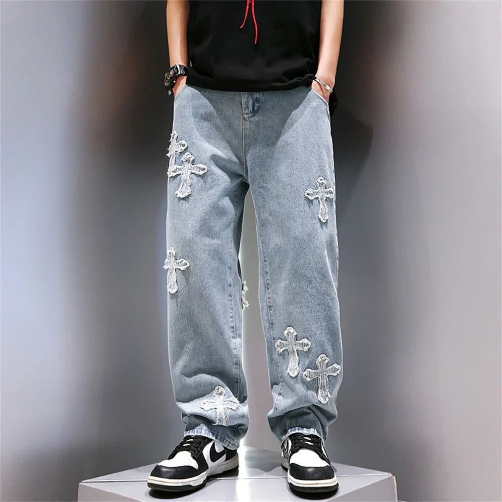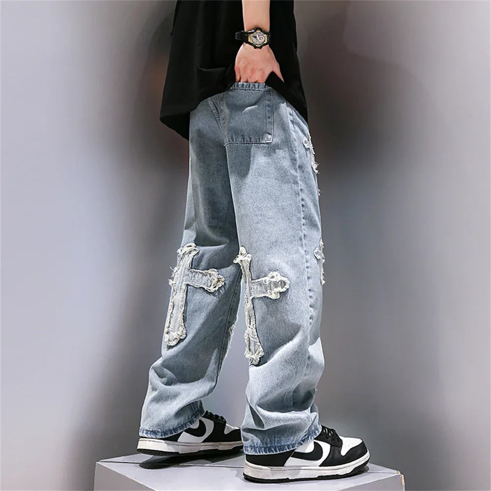 saferido High Street Jeans Men Cross Graphic Baggy Denim Pants Unisex Young Streetwear Blue Loose Punk Casual Fashion Y2k Trousers Summer