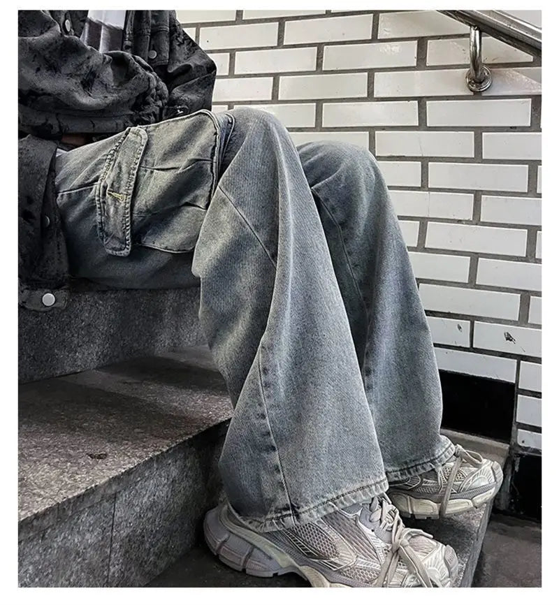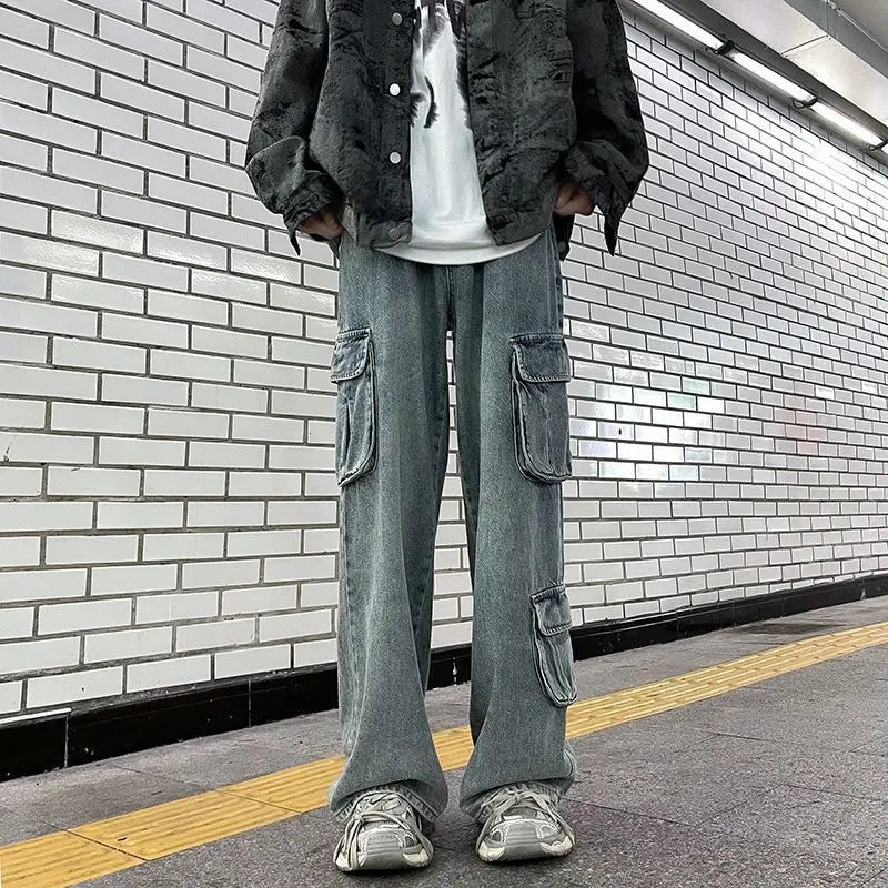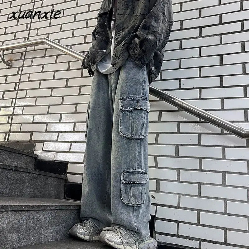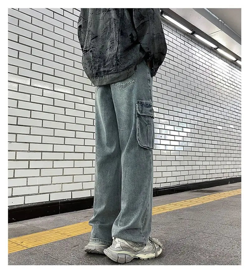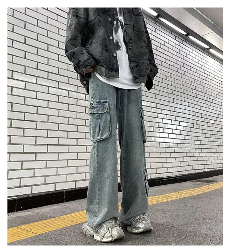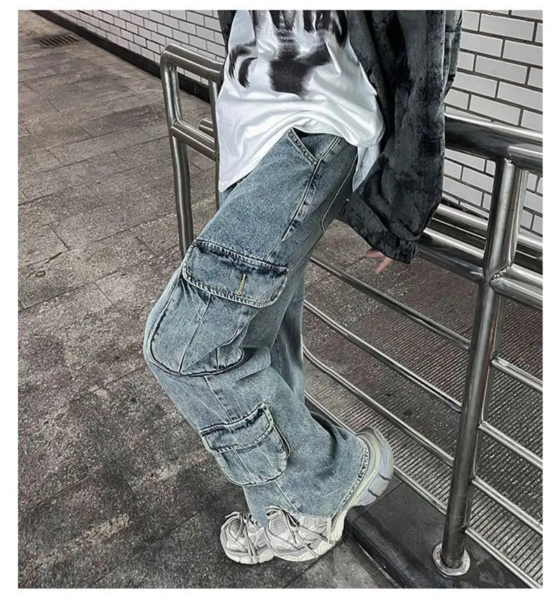 saferido Hip hop American high street washed straight leg large pocket straight leg jeans for men and women loose and trendy casual pants