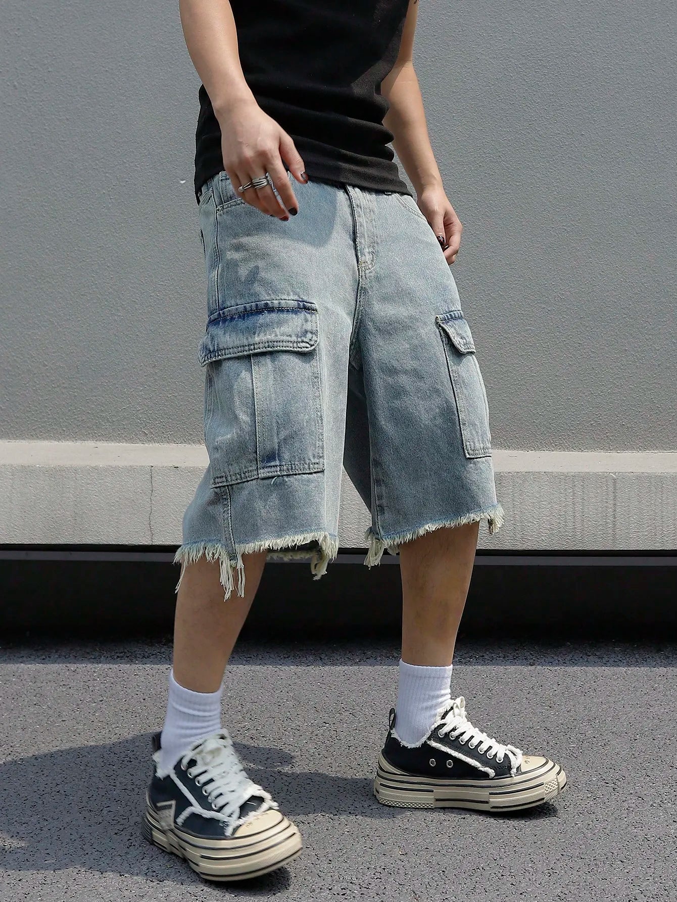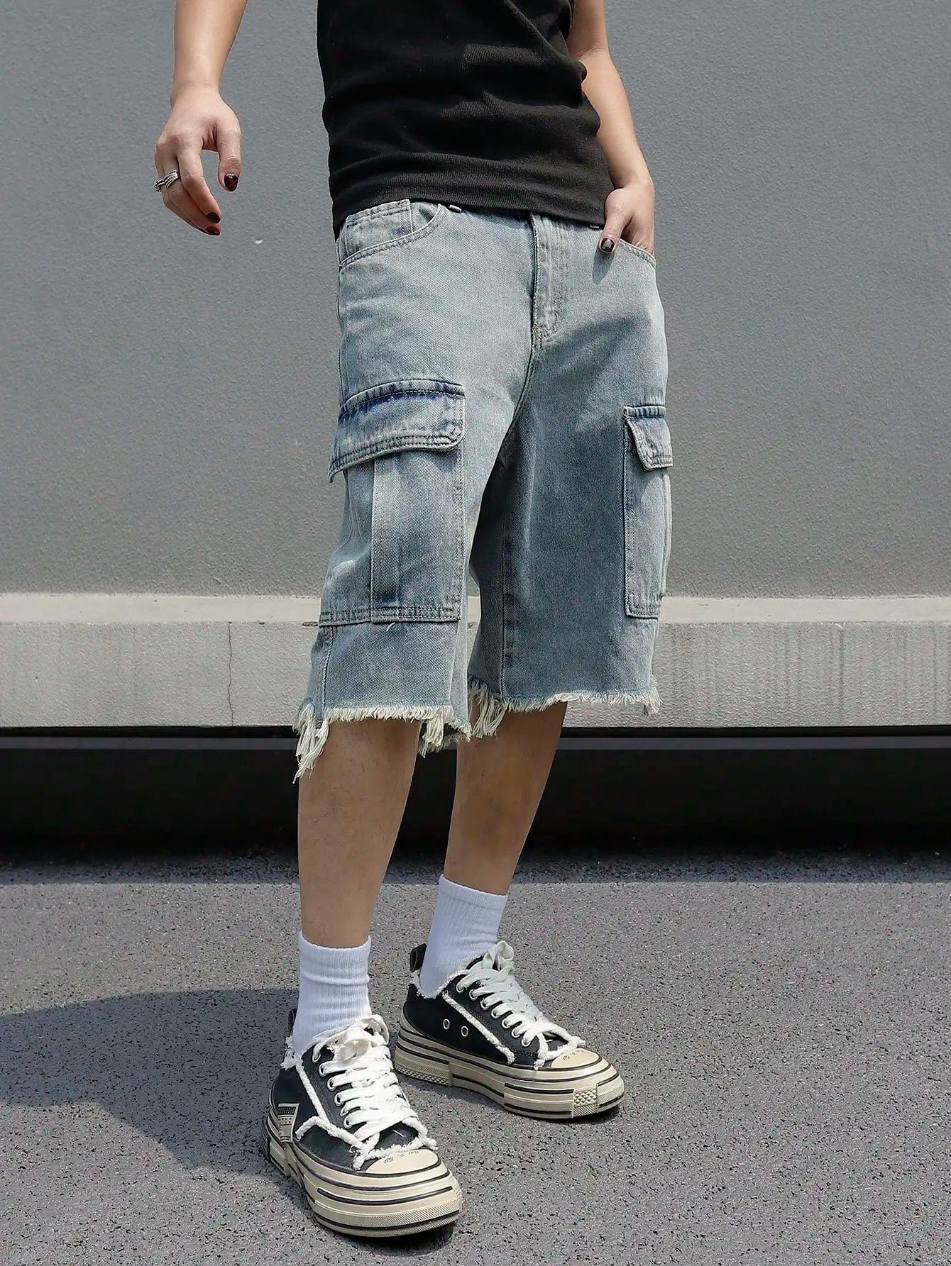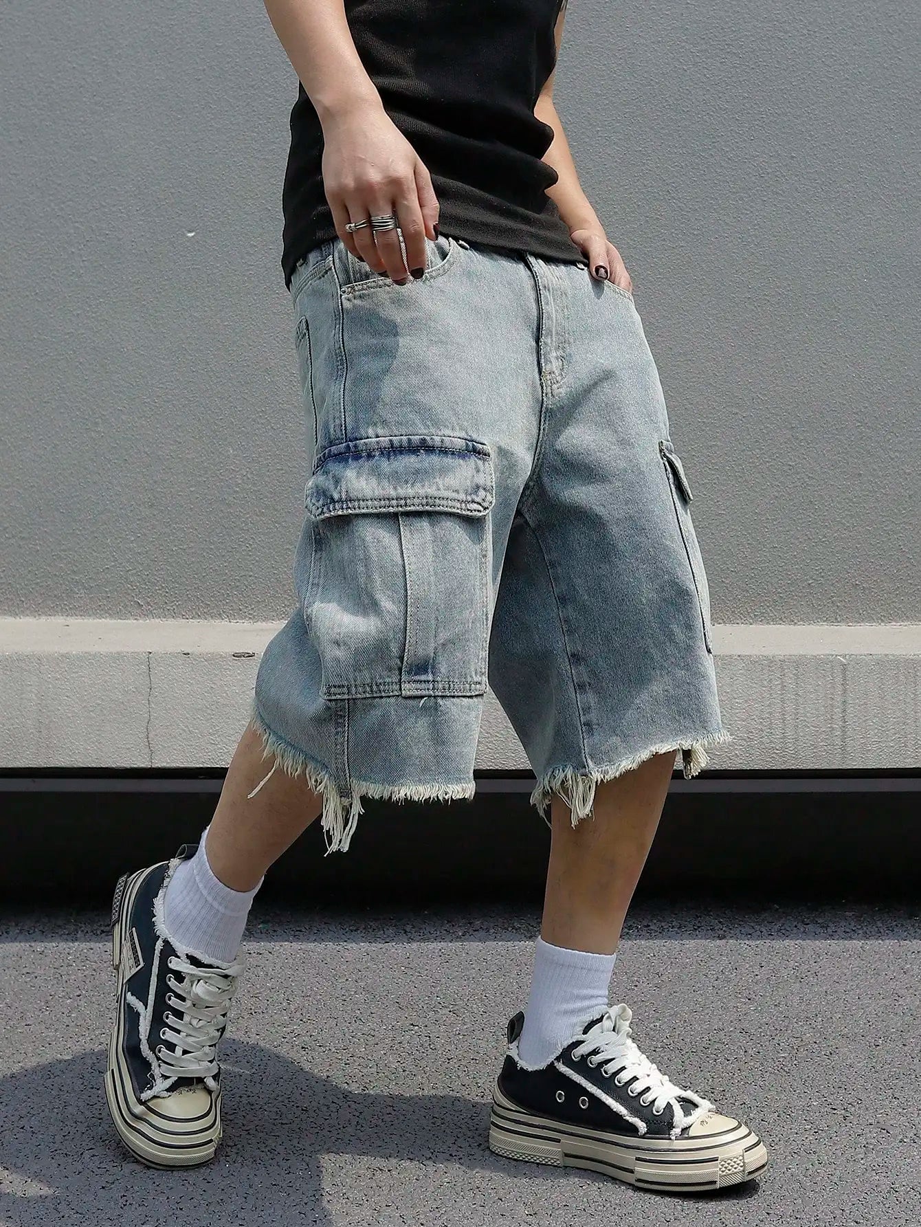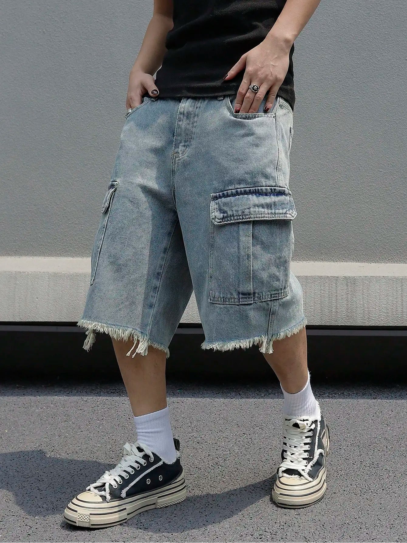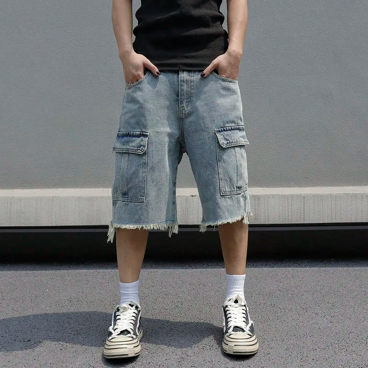 saferido Korean Fashion Men's Wide Leg Denim Shorts Summer New Fashion Loose Casual Elastic Waist Large Pocket Cargo Men's Jeans Shorts