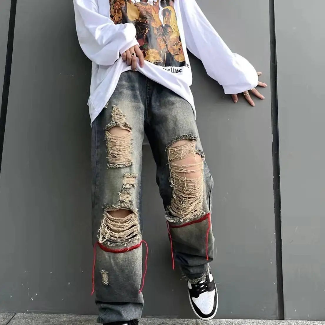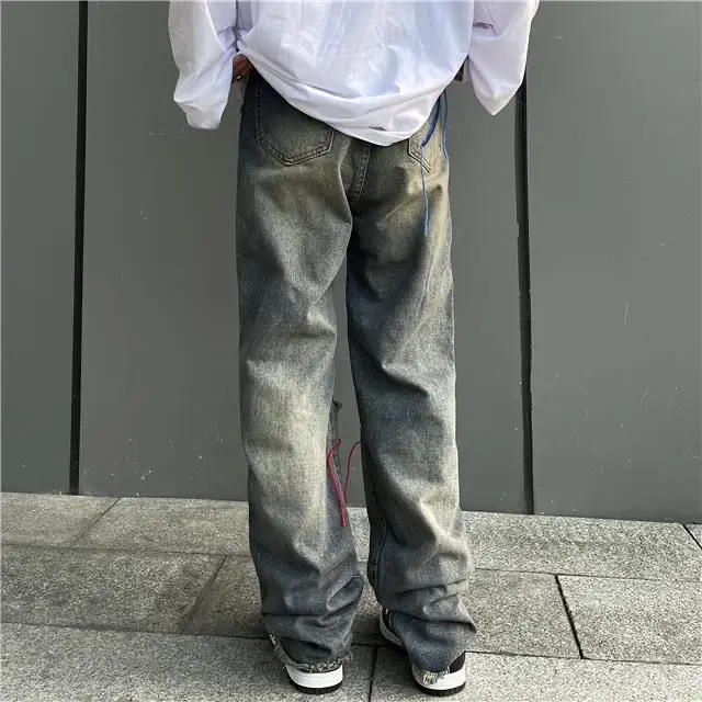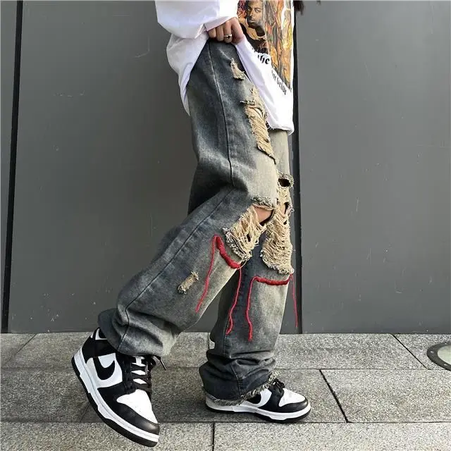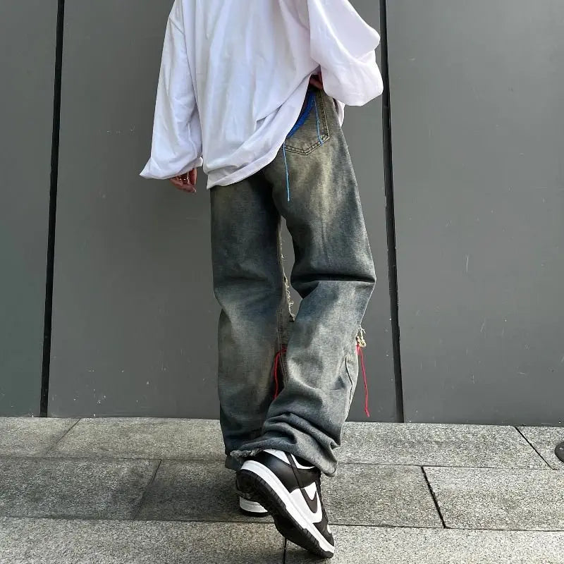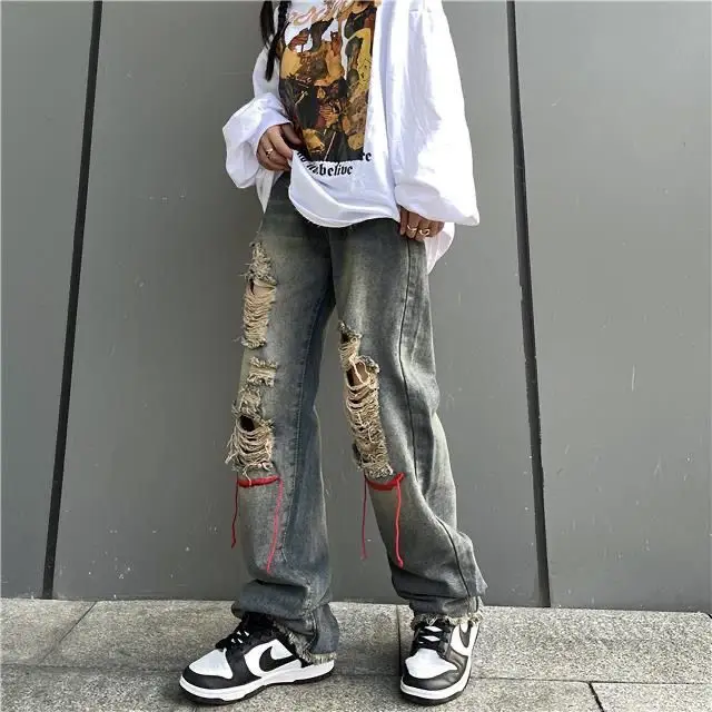saferido Korean Style Ins Hip-Hop Trendy Distressed Red Rope Vintage Jeans Washed And Worn Long Straight Leg Pants
