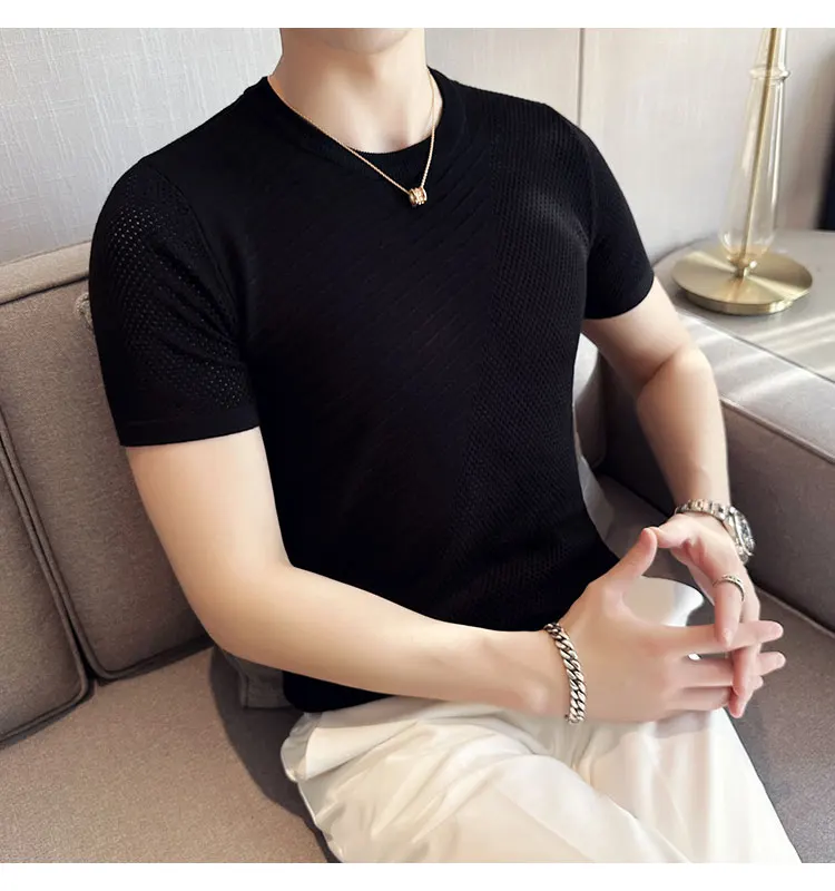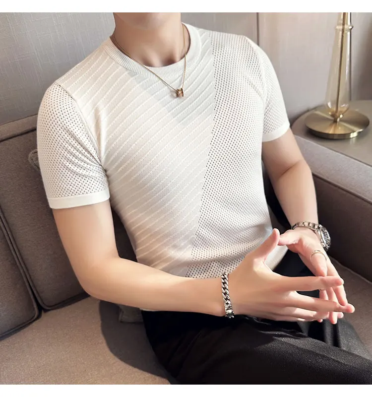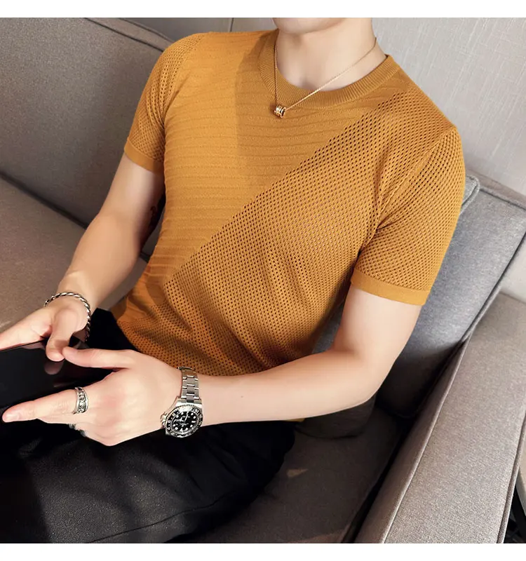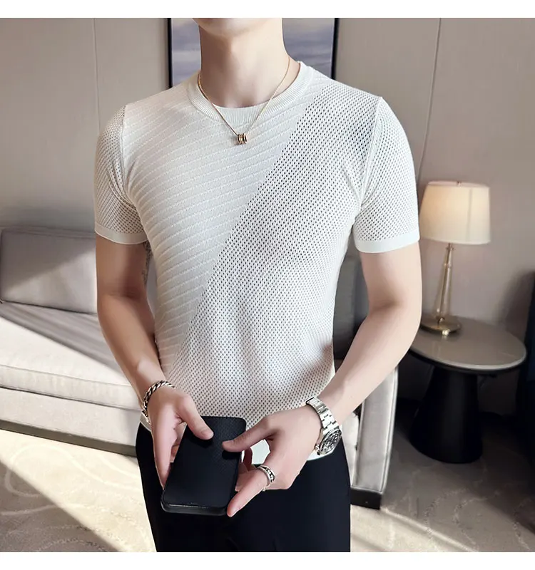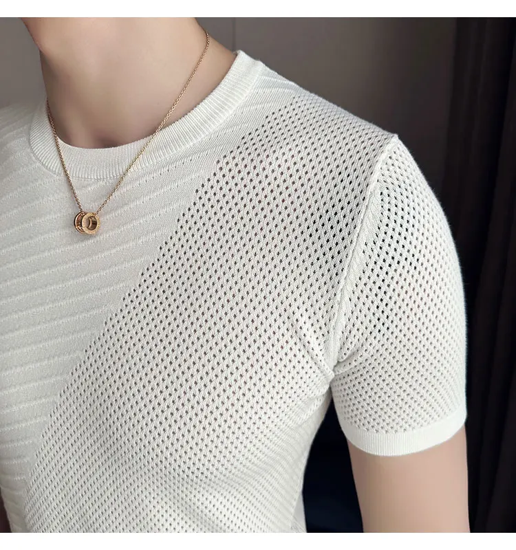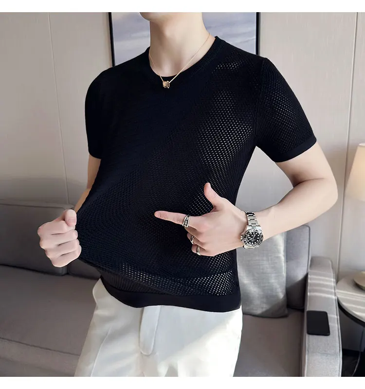 saferido Korean Style Men's Summer Casual Short Sleeve Knitted T-shirt/Male Ice Silk Hollow Out Round Neck T-shirt S-3XL