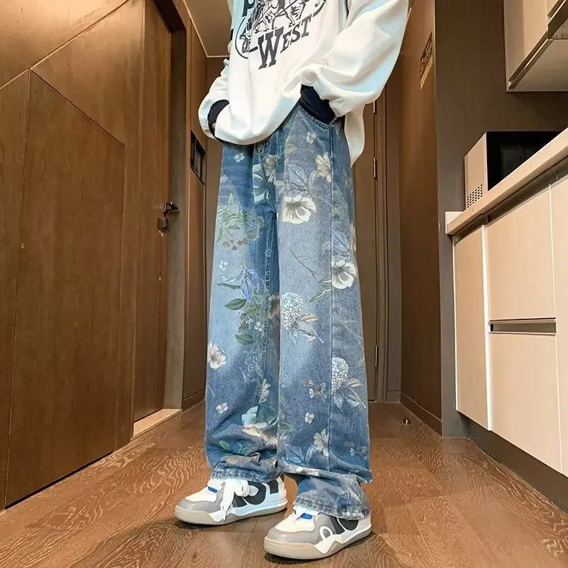 saferido Man Cowboy Pants Wide Leg Trousers Straight Men's Jeans with Print Designer Fashion Casual Washed Korean Plus Size Cotton