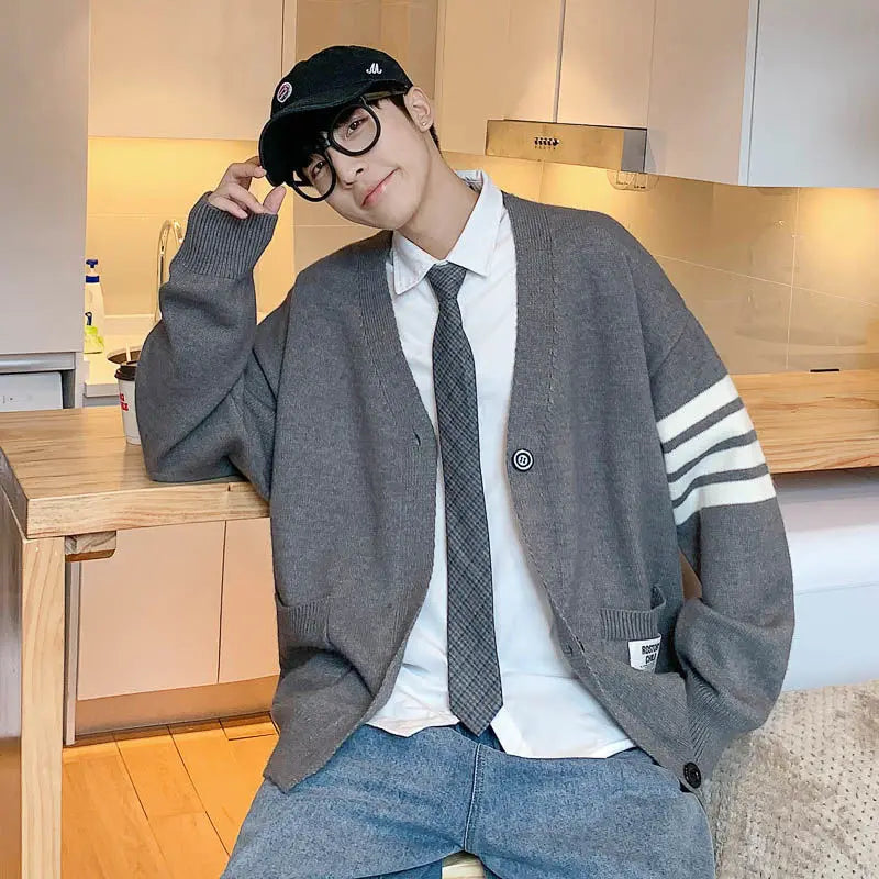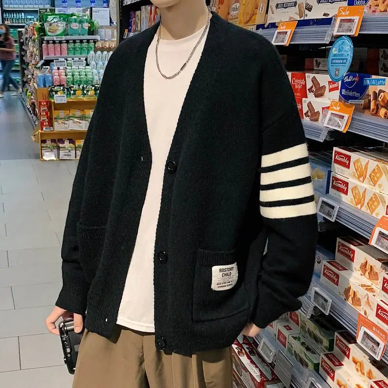 saferido Men Korean Clothes Hoodie with Pockets Striped Knitted Sweaters for Men Cardigan Jacket Coat Fun Korean Autumn Loose Fit Warm