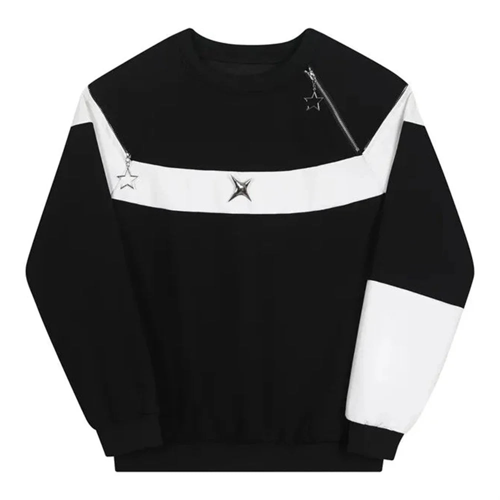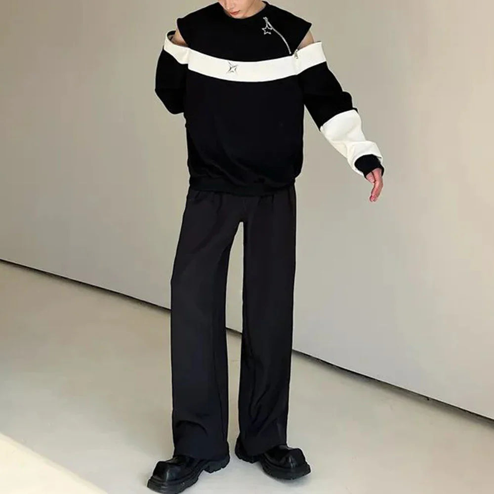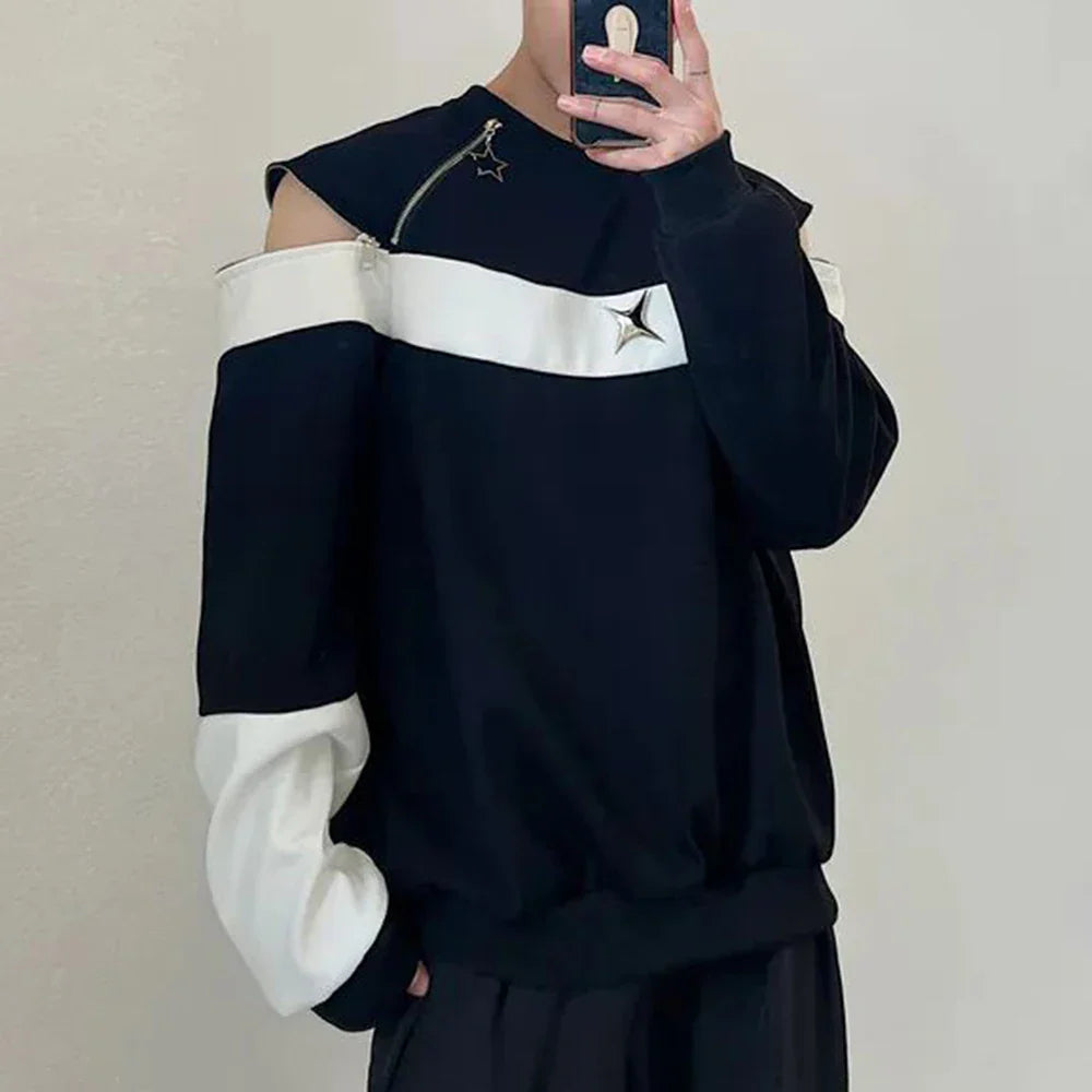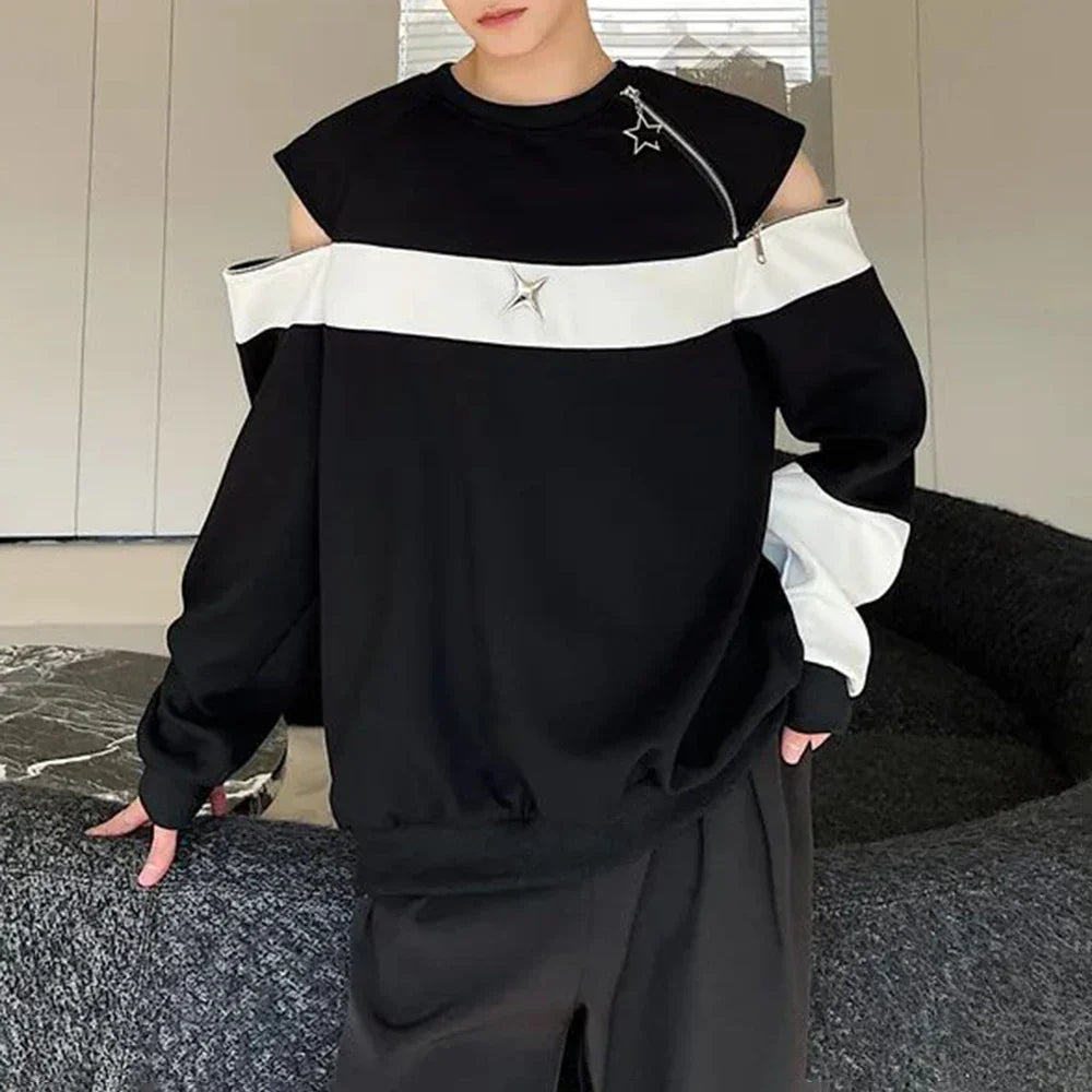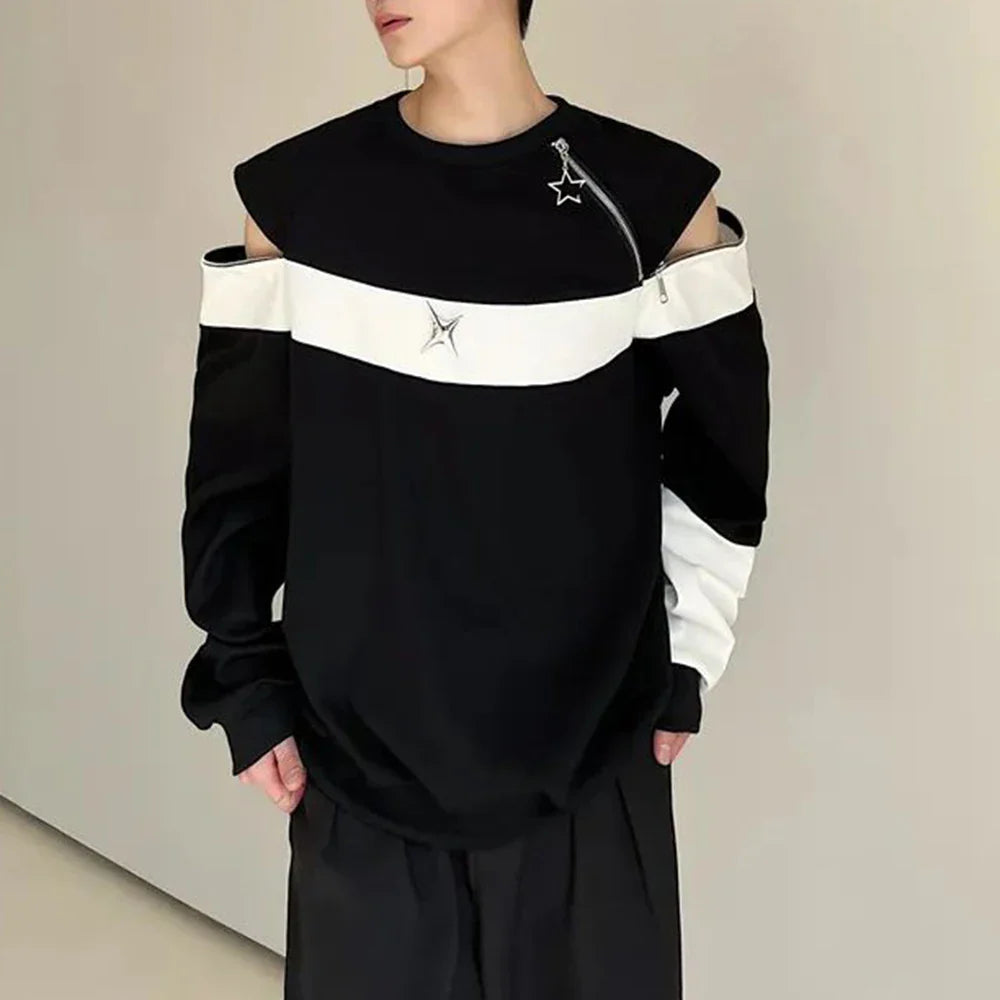 saferido Mens Autumn Winter Abstinence Zipper Sweatshirt Genderless Korean Color Matching Sexy Hollow Metal Open Shoulder Top Jacket