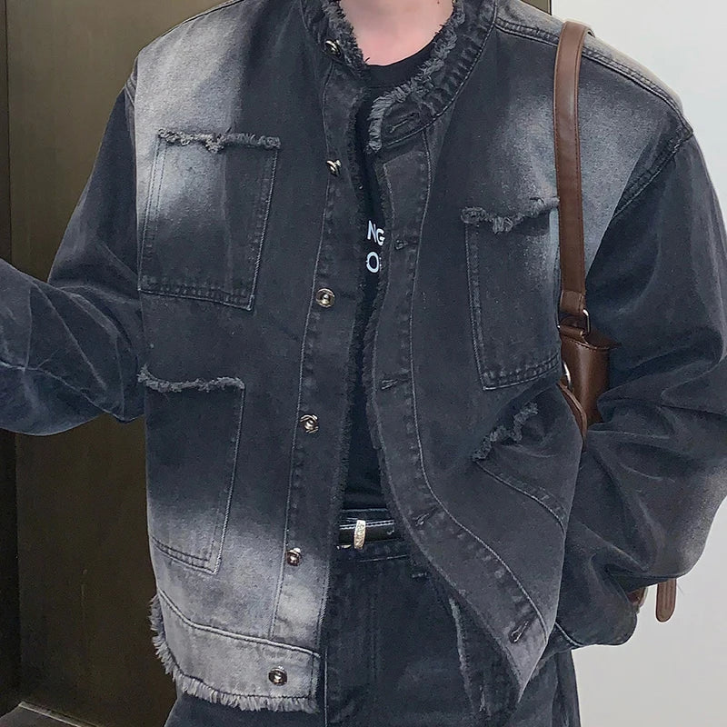 saferido Men's Casual Washed Denim Jacket Streetwear Ripped Stand Collar Texture Korean Harajuku Retro Long Sleeve Luxury Coat 2024 New
