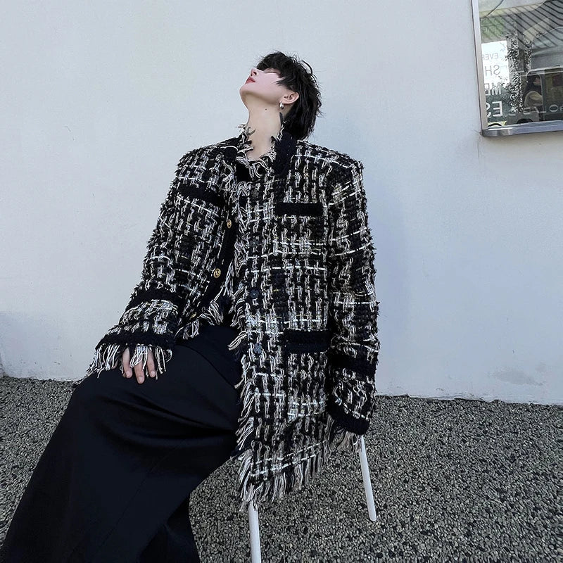 saferido Men's Clothing 2024 Autumn Winter Round Collar Weave Tweed Loose Coat Korean Strretwear Single Breasted Jackets For Male