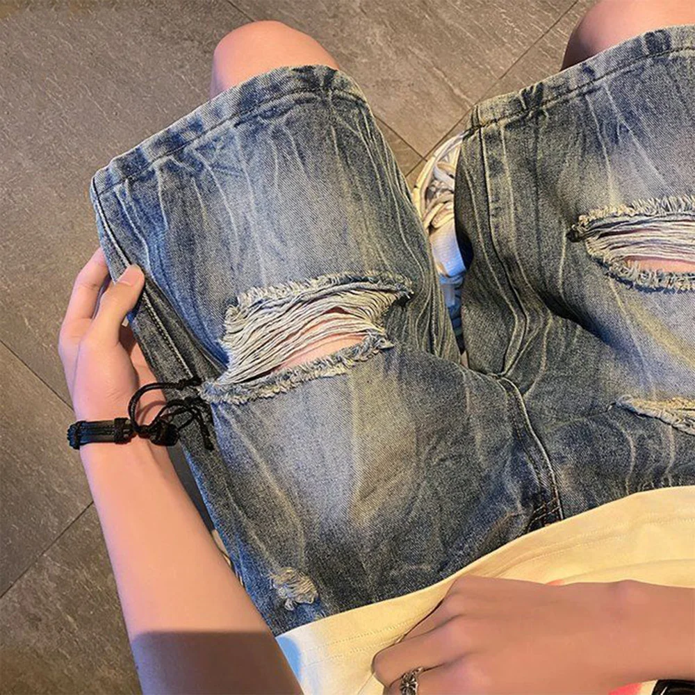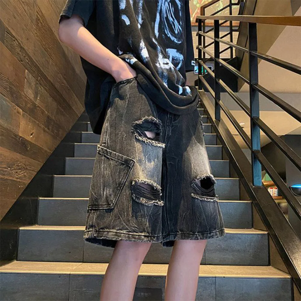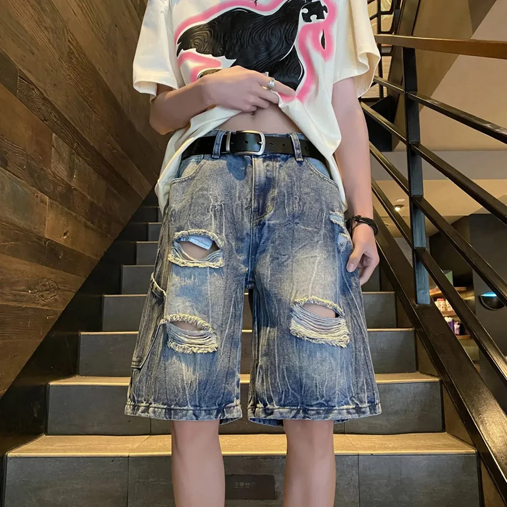 saferido Mens Denim Shorts Ripped Trendy Y2k Lightning Pattern Shorts High Street American Style Versatile Retro Shorts Thin Summer