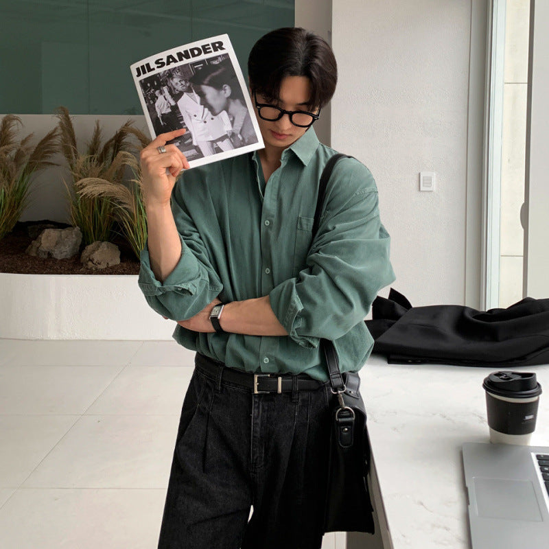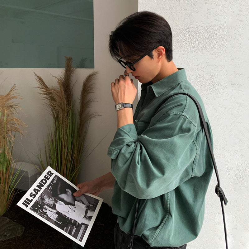 mens fall fashion BJ Washed Distressed Long-Sleeved Shirt Men's Autumn Loose Casual Shirt Korean Style Trendy Retro Lapel Coat