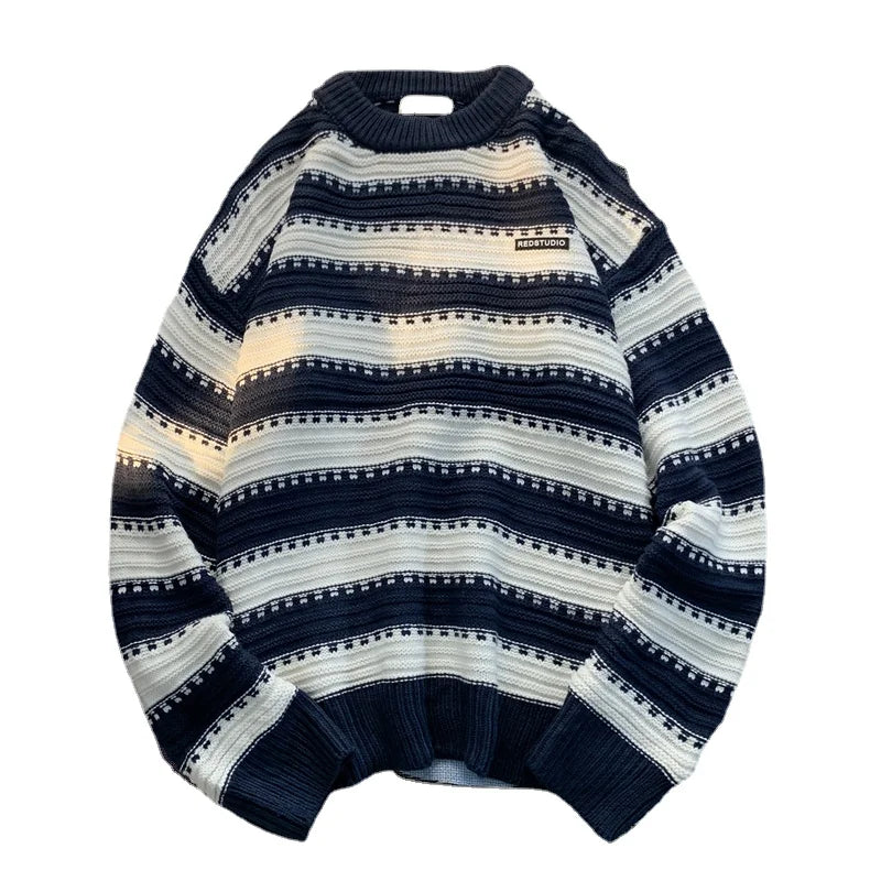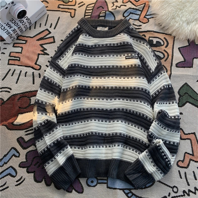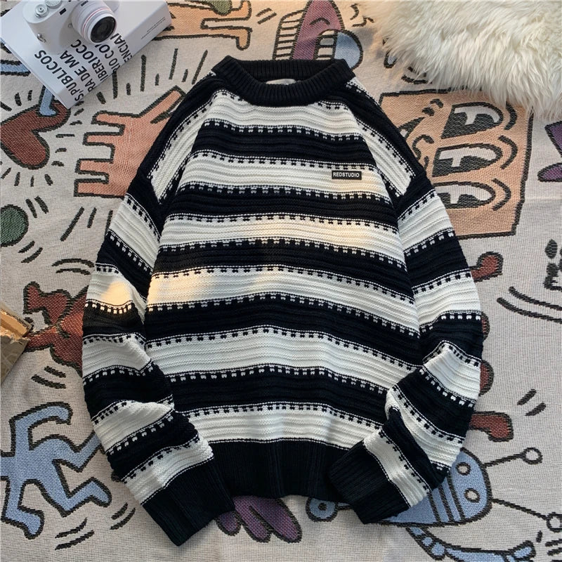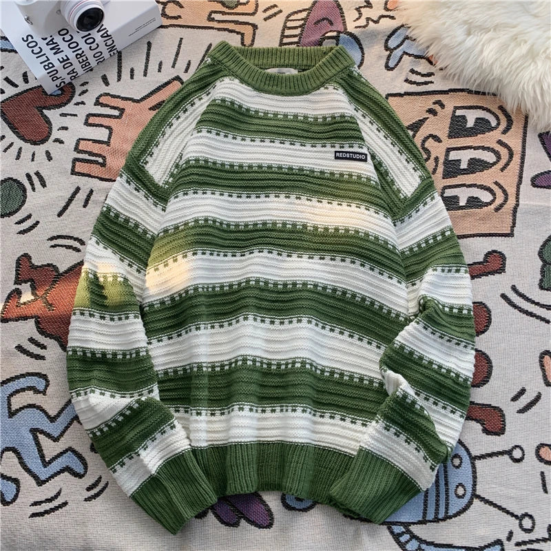 saferido Men's Knitted Pullover Korean College Style Striped Crew Neck Women Unisex Sweater Pullovers Label Design Knit Male Clothing