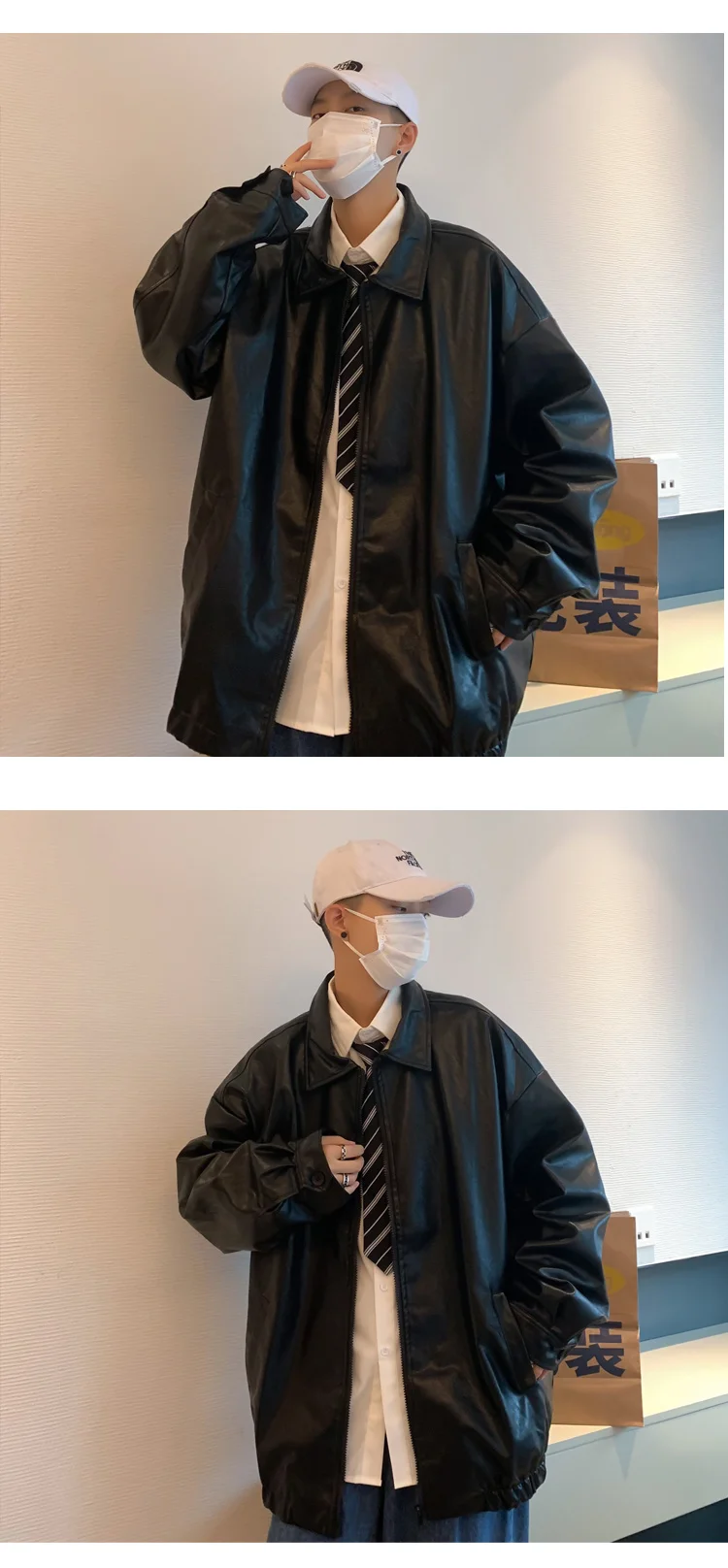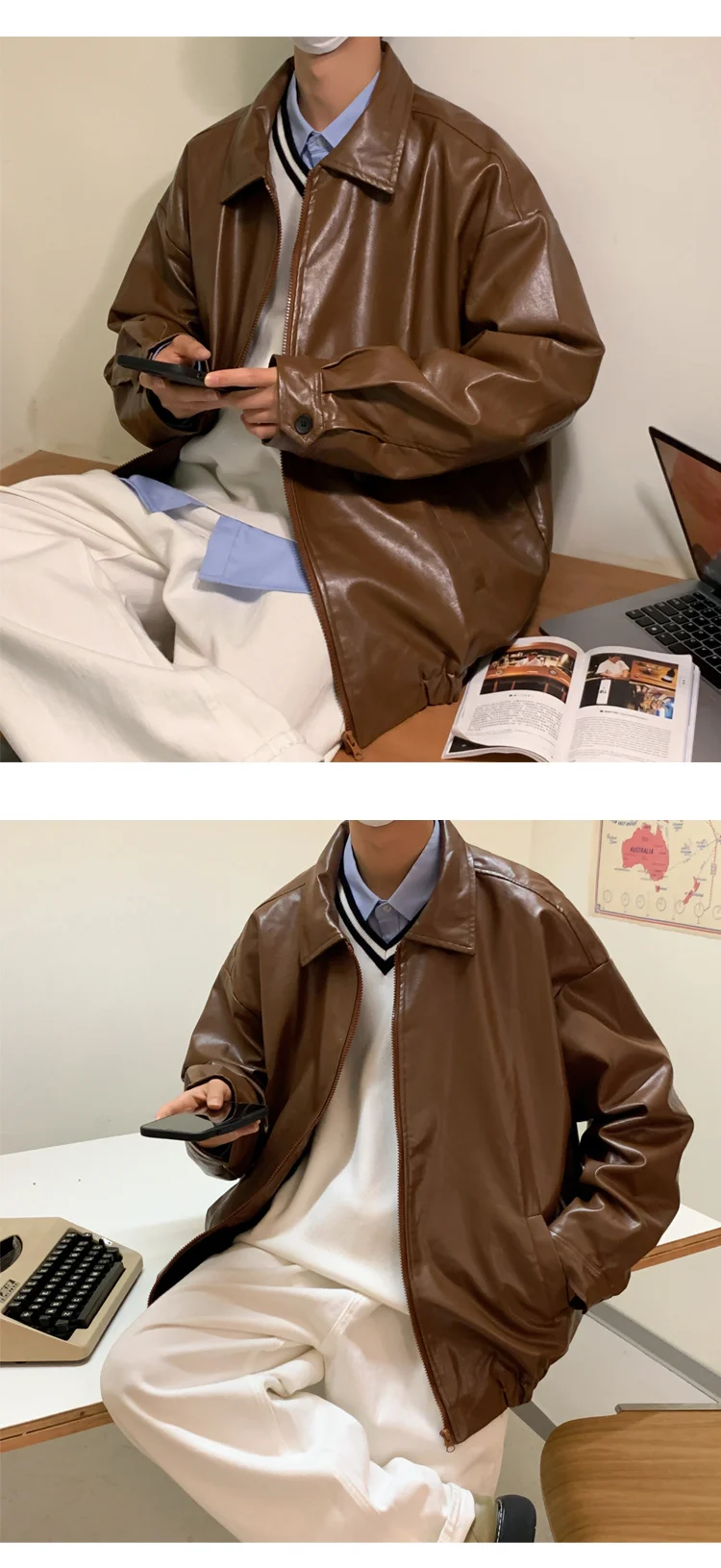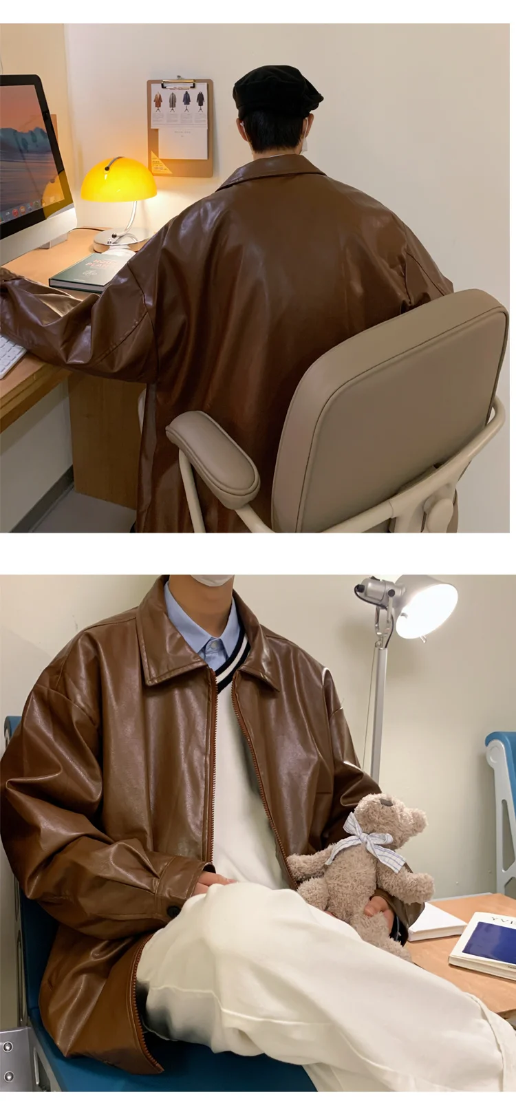 saferido Men's Motorcycle PU Leather Jackets Loose Casual Baseball Lapel Collar Coats Brown Color Oversized Black Outerwear M-2XL